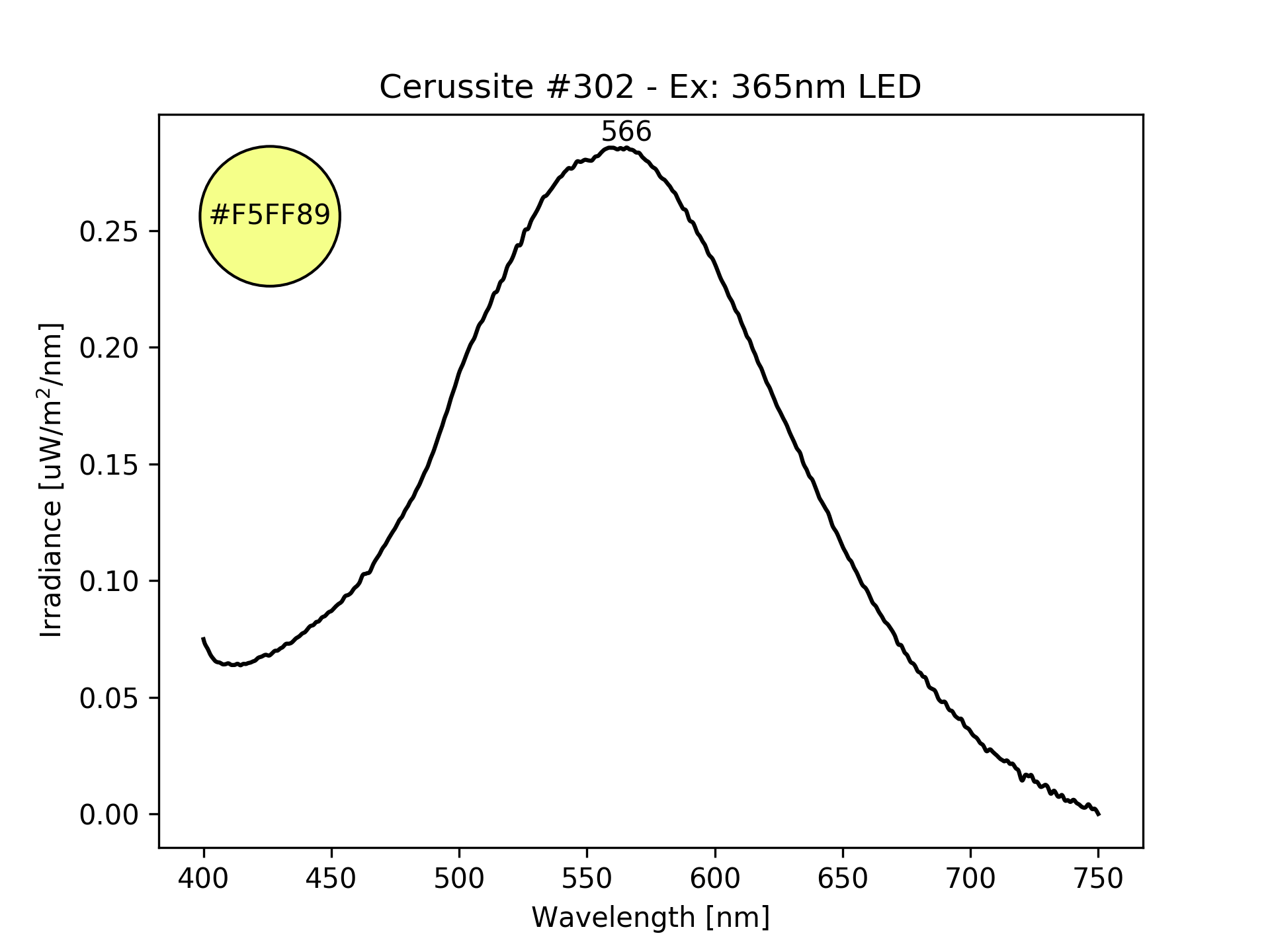 | Cerussite (#302) | Blanchard Mine, New Mexico, USA | 365nm LED | Lead? | |