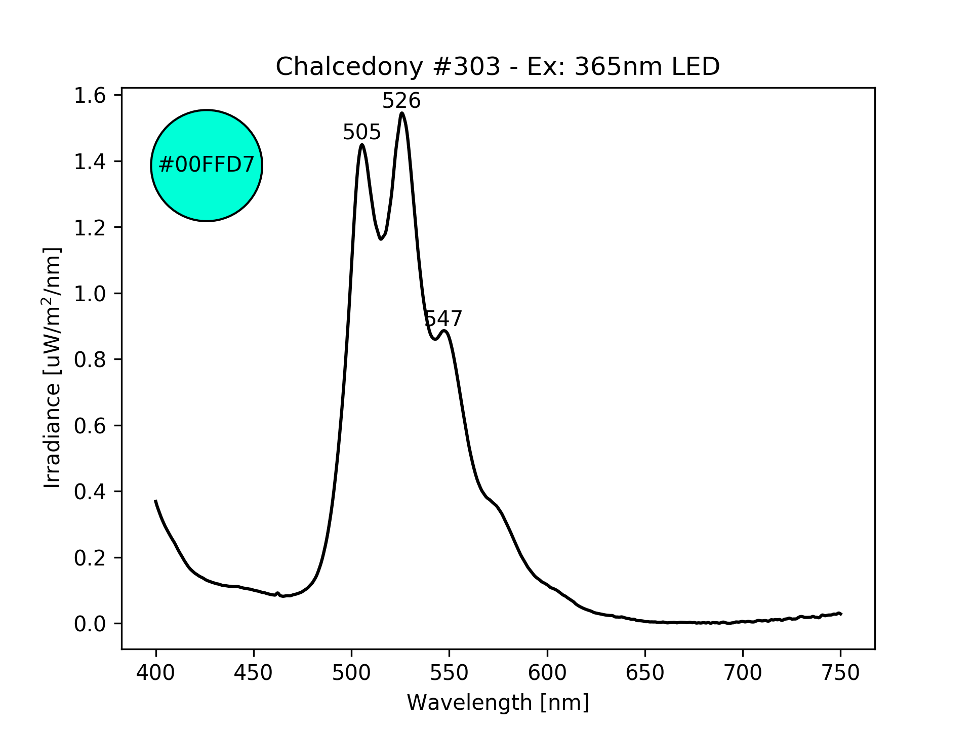 | Chalcedony (#303) | Mule Creek, New Mexico, USA | 365nm LED | UO22+ | |