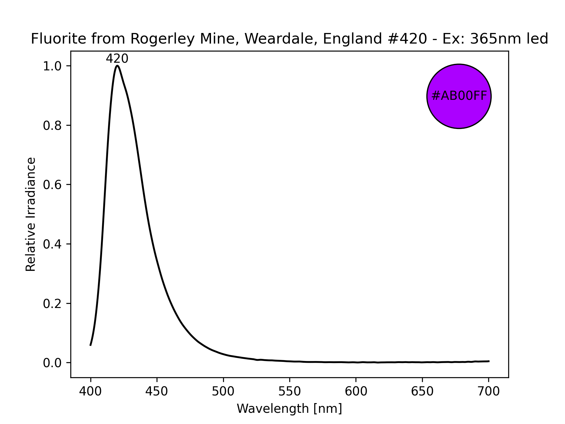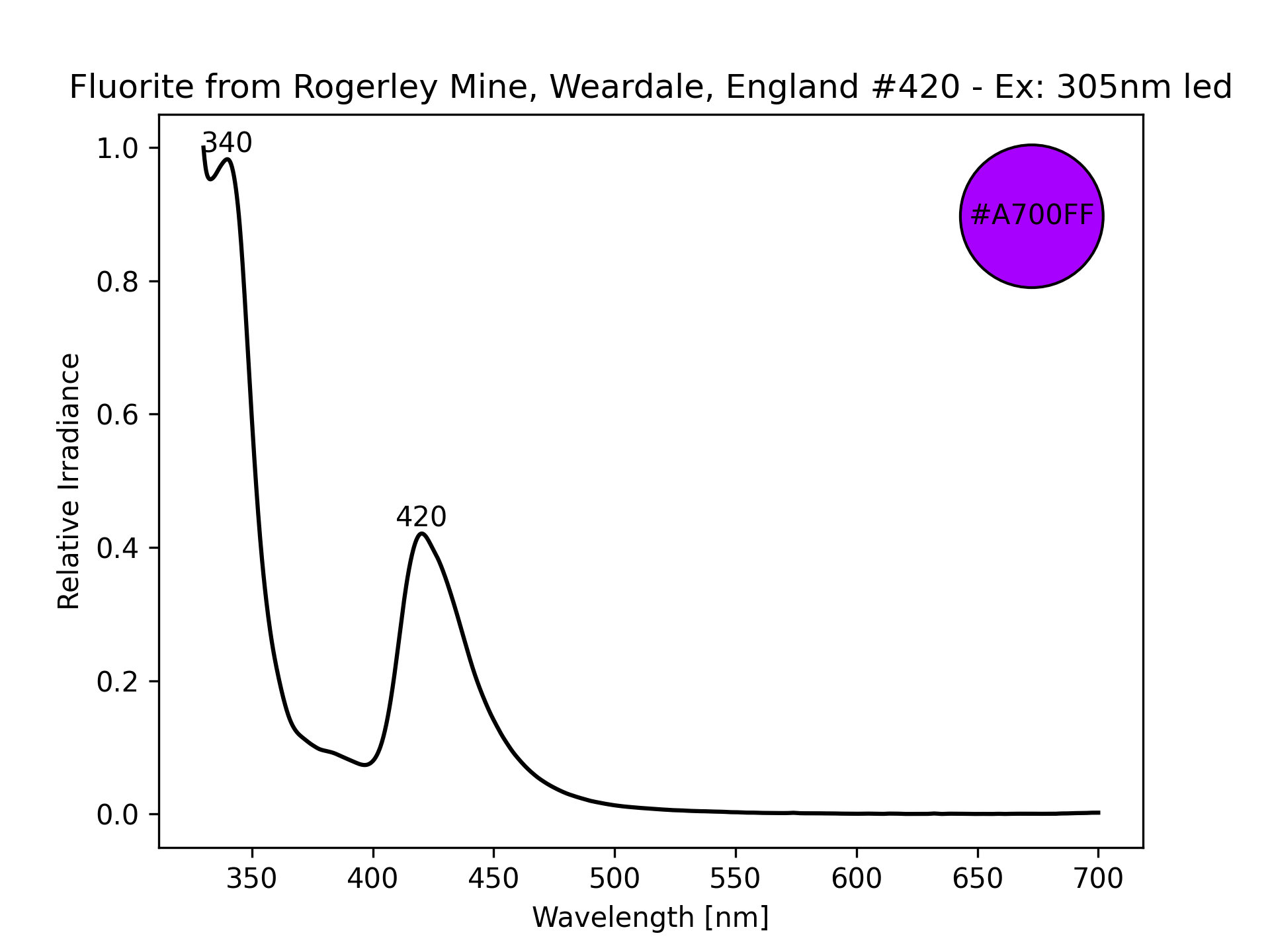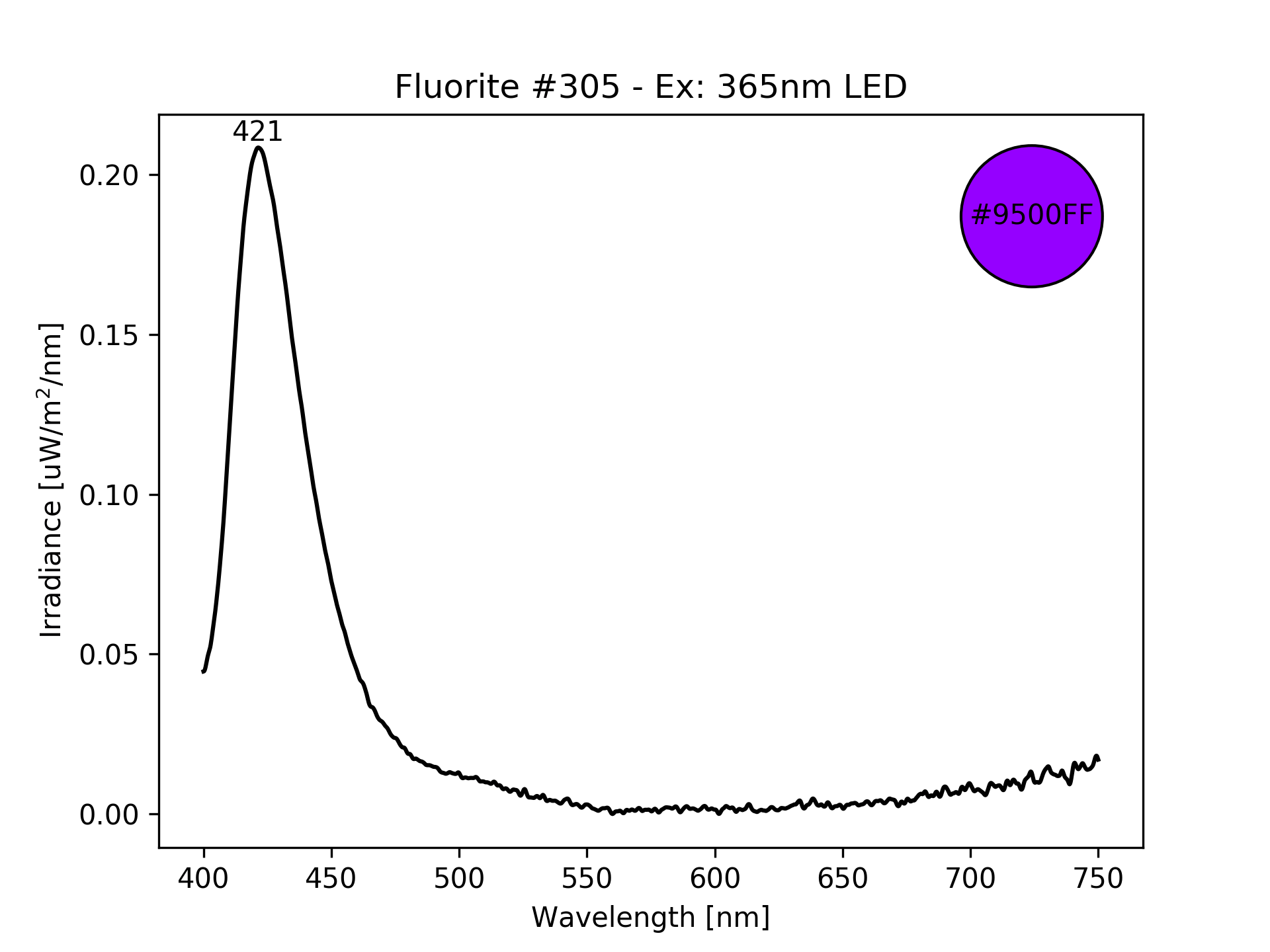 | Fluorite (#429) | Rogerley Mine, Weardale, UK | 305nm LED | Eu2+; Ce3+ | |