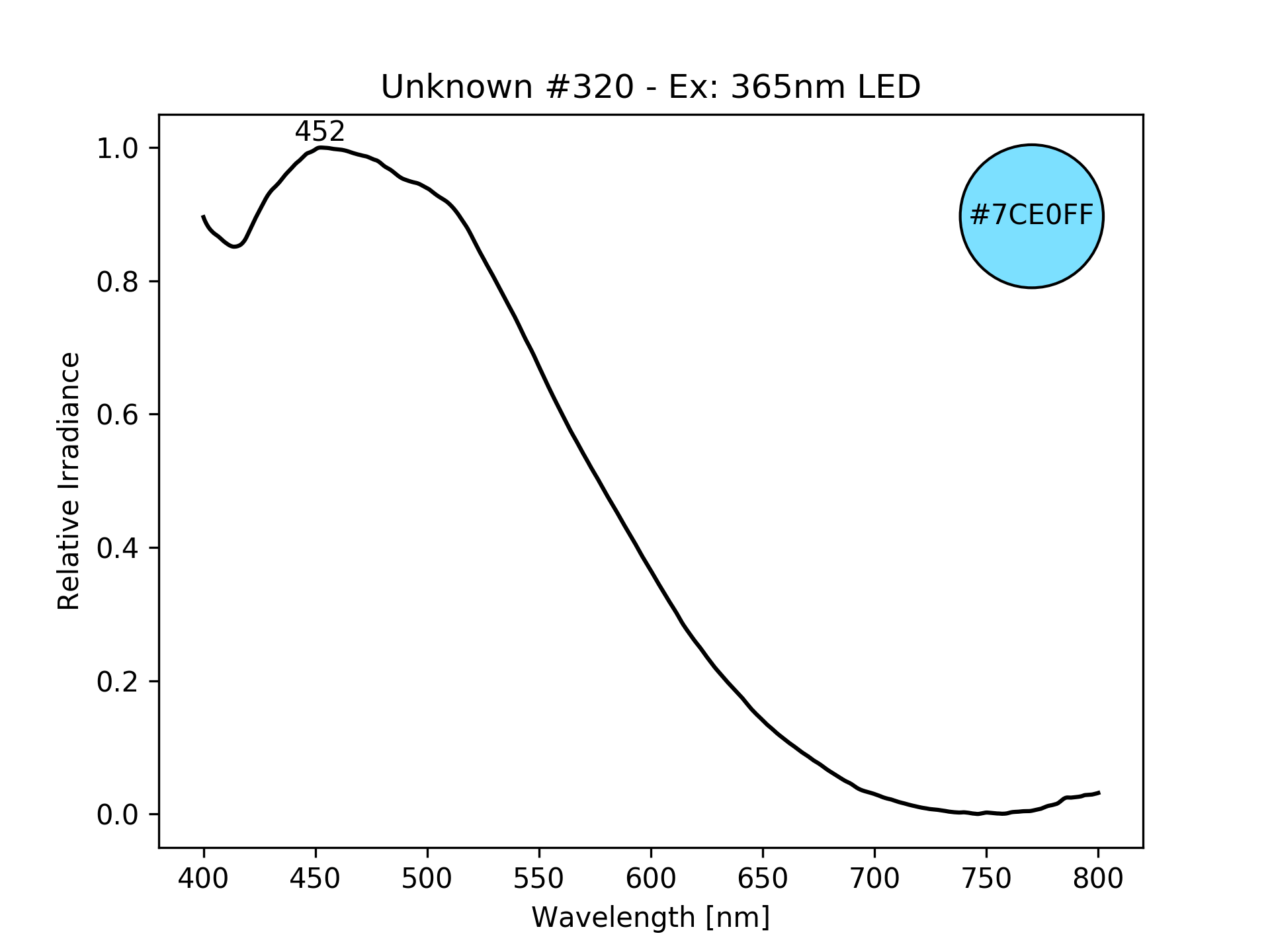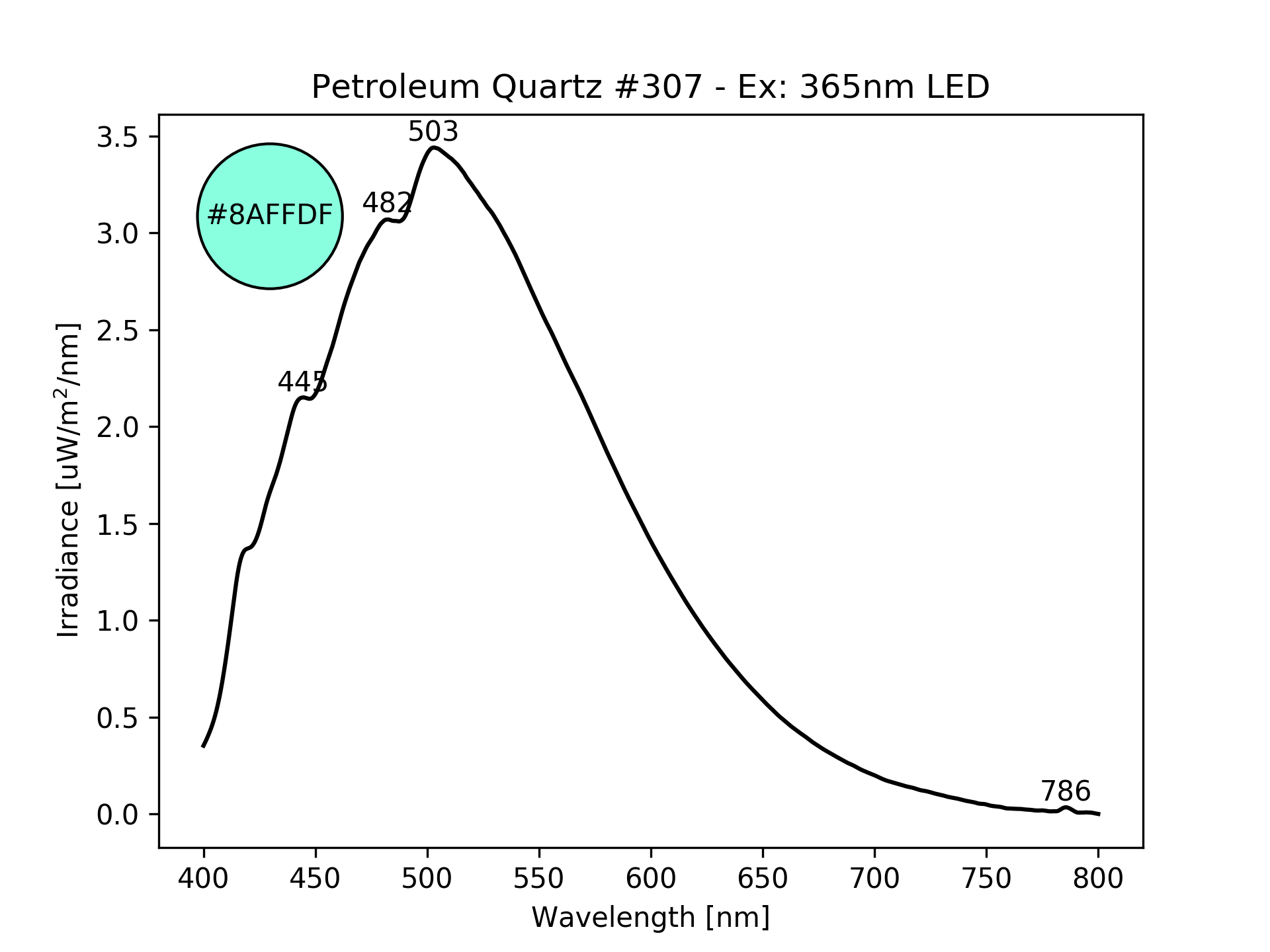 | Fluorite (#238) | Unknown | 365nm LED | Eu2+ | |
