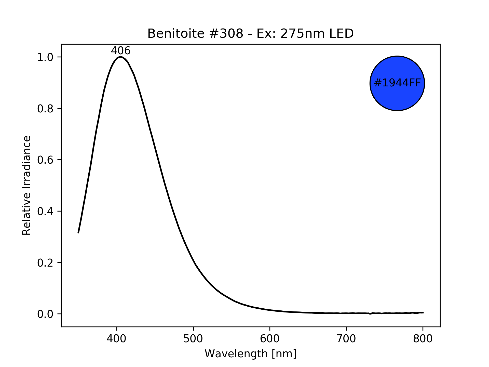 | Benitoite (#308) | California State Gem Mine, San BenitoCo. California, USA | 275nm LED | TiO6 | |