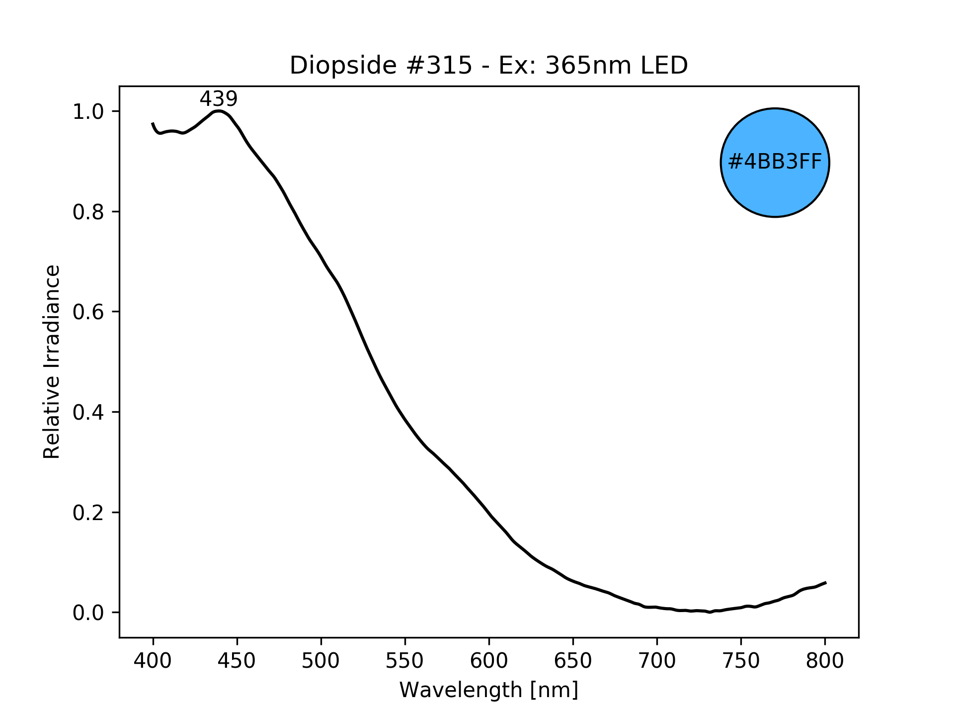 | Diopside (#315) | Lake Valhalla Quarry, New Jersey, USA | 275nm LED | TiO6 | |