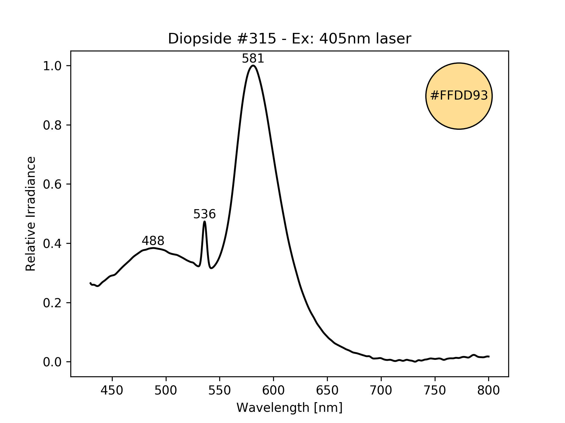 | Diopside (#315) | Lake Valhalla Quarry, New Jersey, USA | 405nm Laser | Mn2+ | |