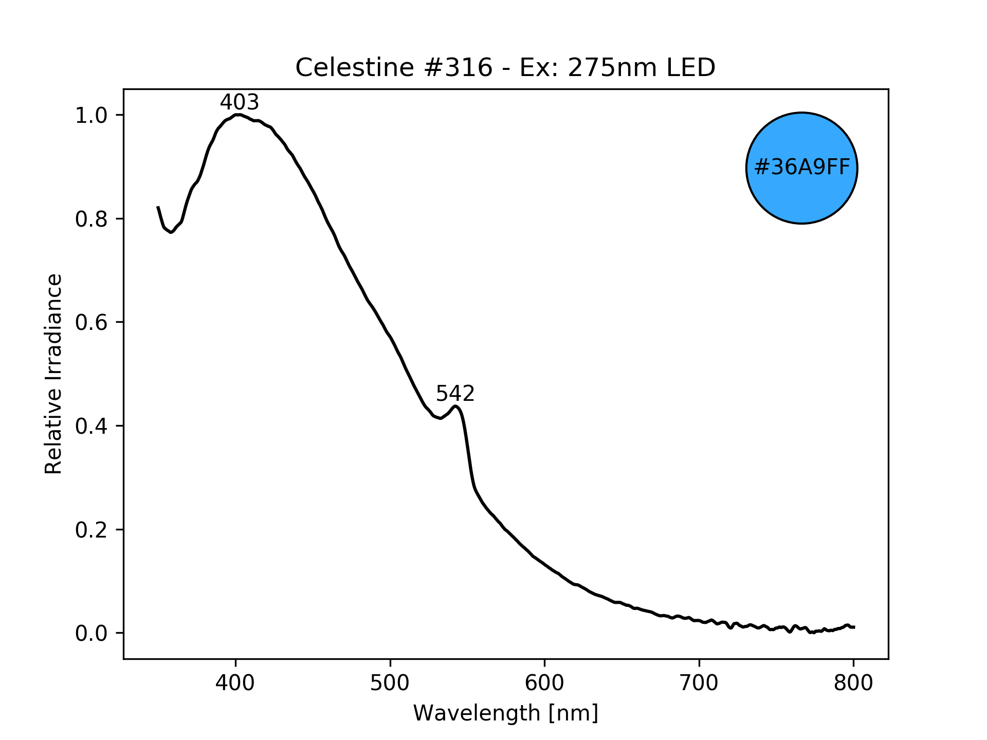 | Celestine (#316) | La Grasta mine, Sicily, Italy | 275nm LED | Organic | |