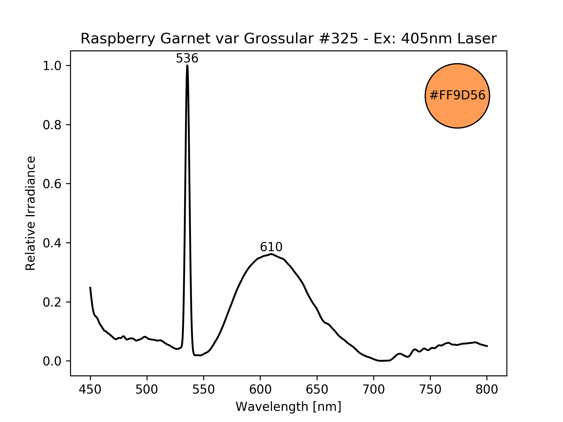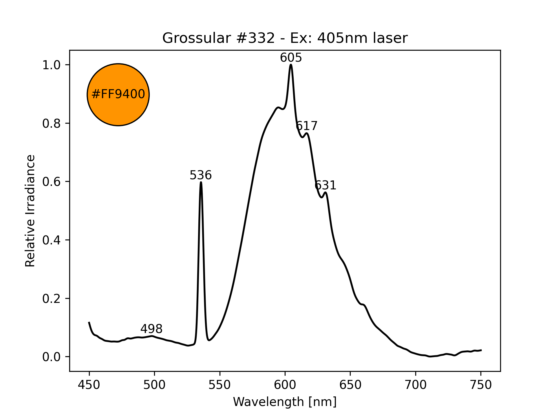 | Grossular (#332) | Stifle Claim, California, USA | 405nm Laser | Mn2+, ?? | |