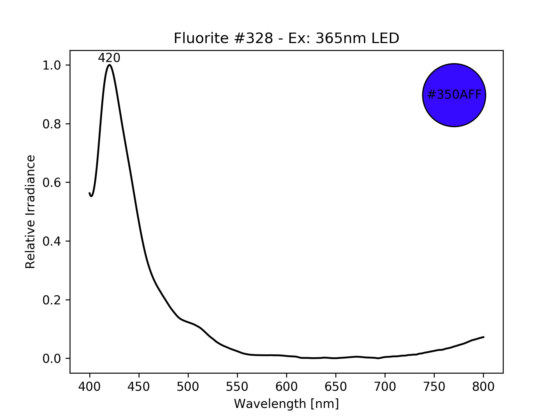 | Fluorite (#328) | Fujian, China | 365nm LED | Eu2+ | |