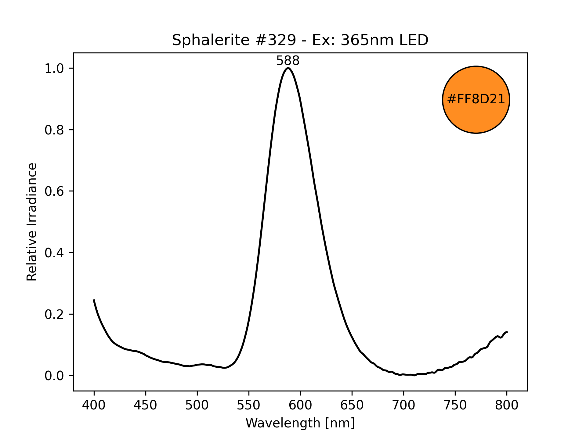| Sphalerite (#329) | Mundo Nuevo Mine, Huamachuco, Peru | 365nm LED | Mn2+ | |