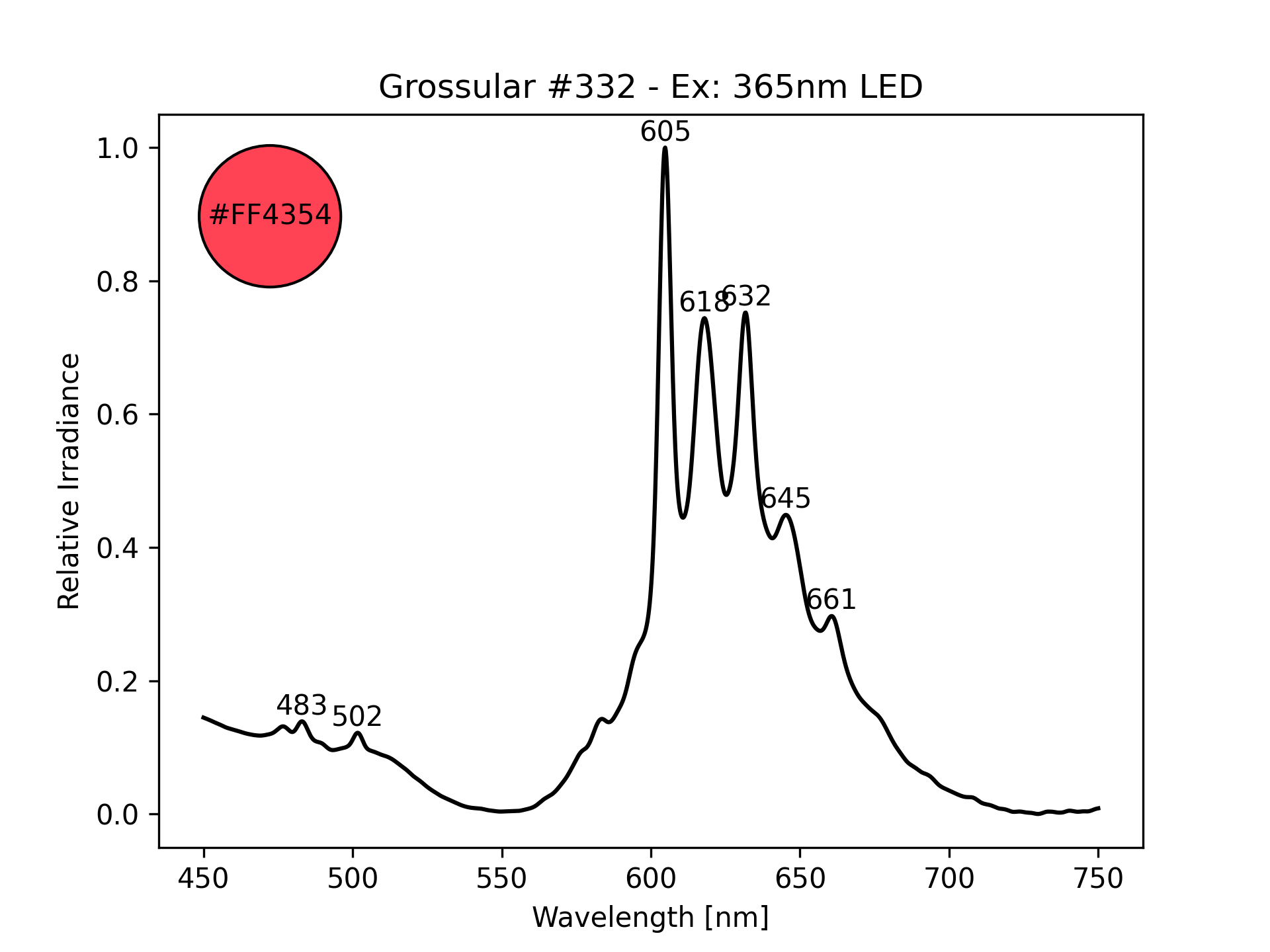 | Grossular (#332) | Stifle Claim, California, USA | 365nm LED | ?? | |