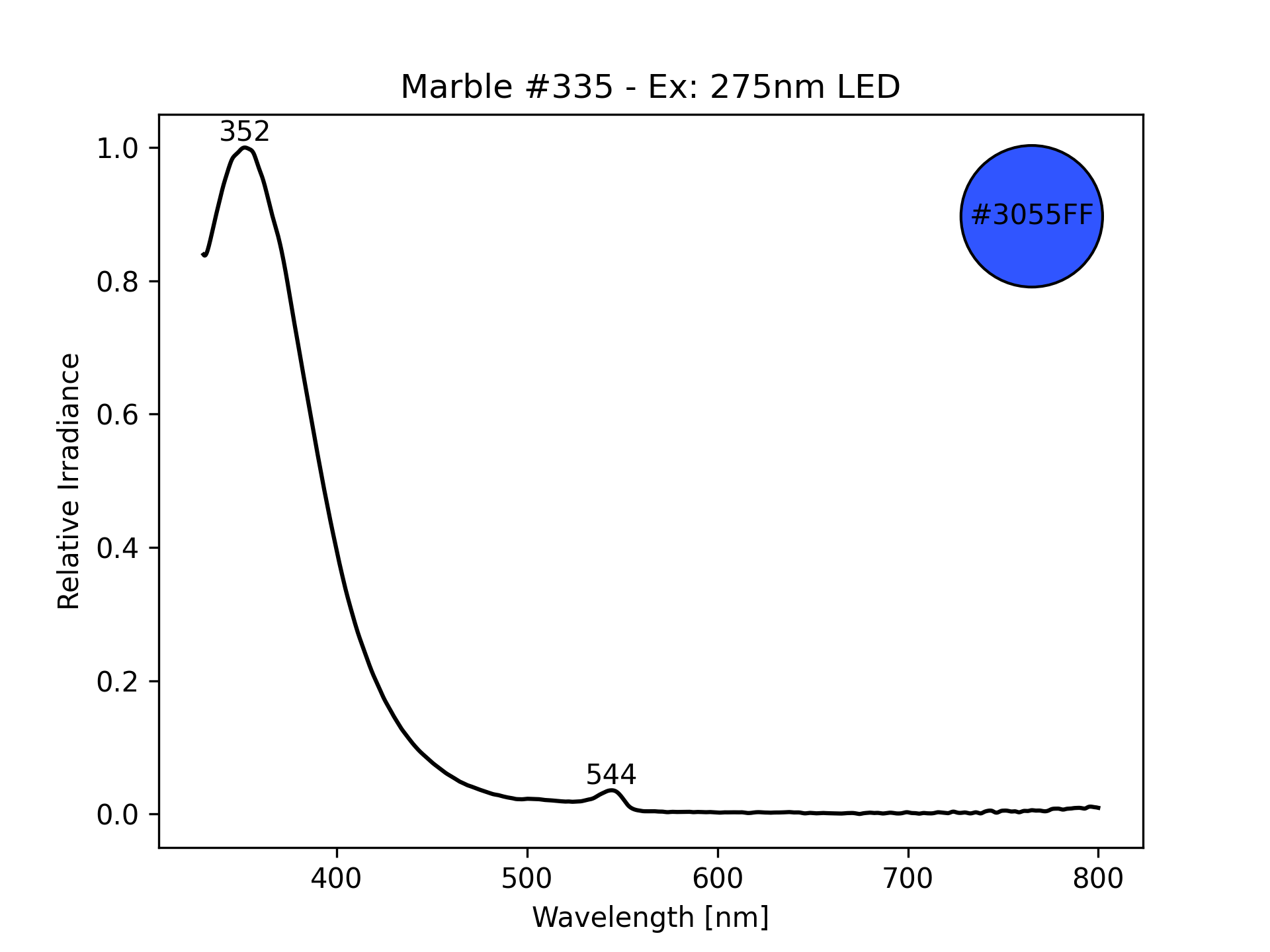 | Marble (#335) | Franklin Quarry, Franklin, NJ, USA | 275nm LED | Ce3+ | |