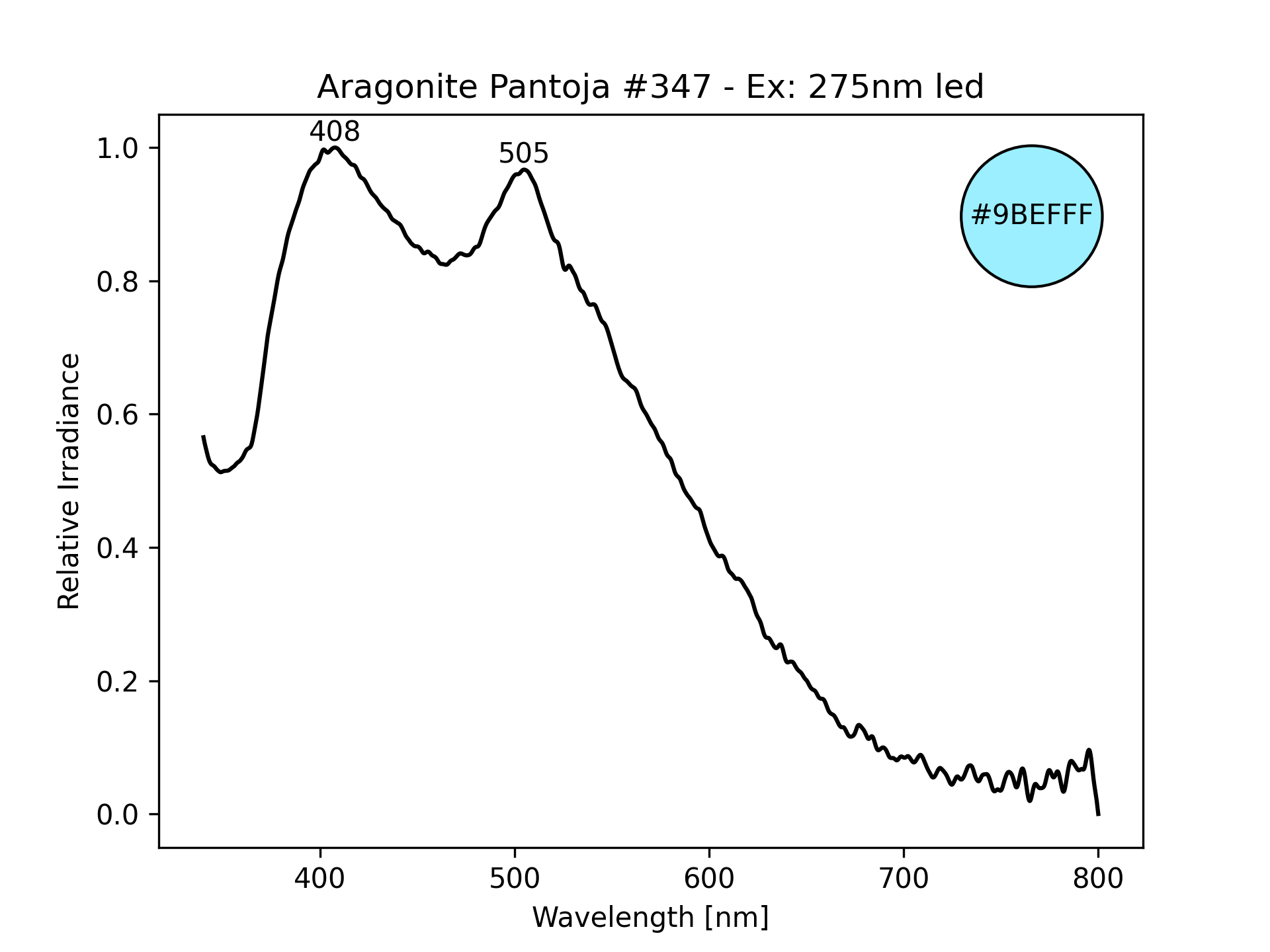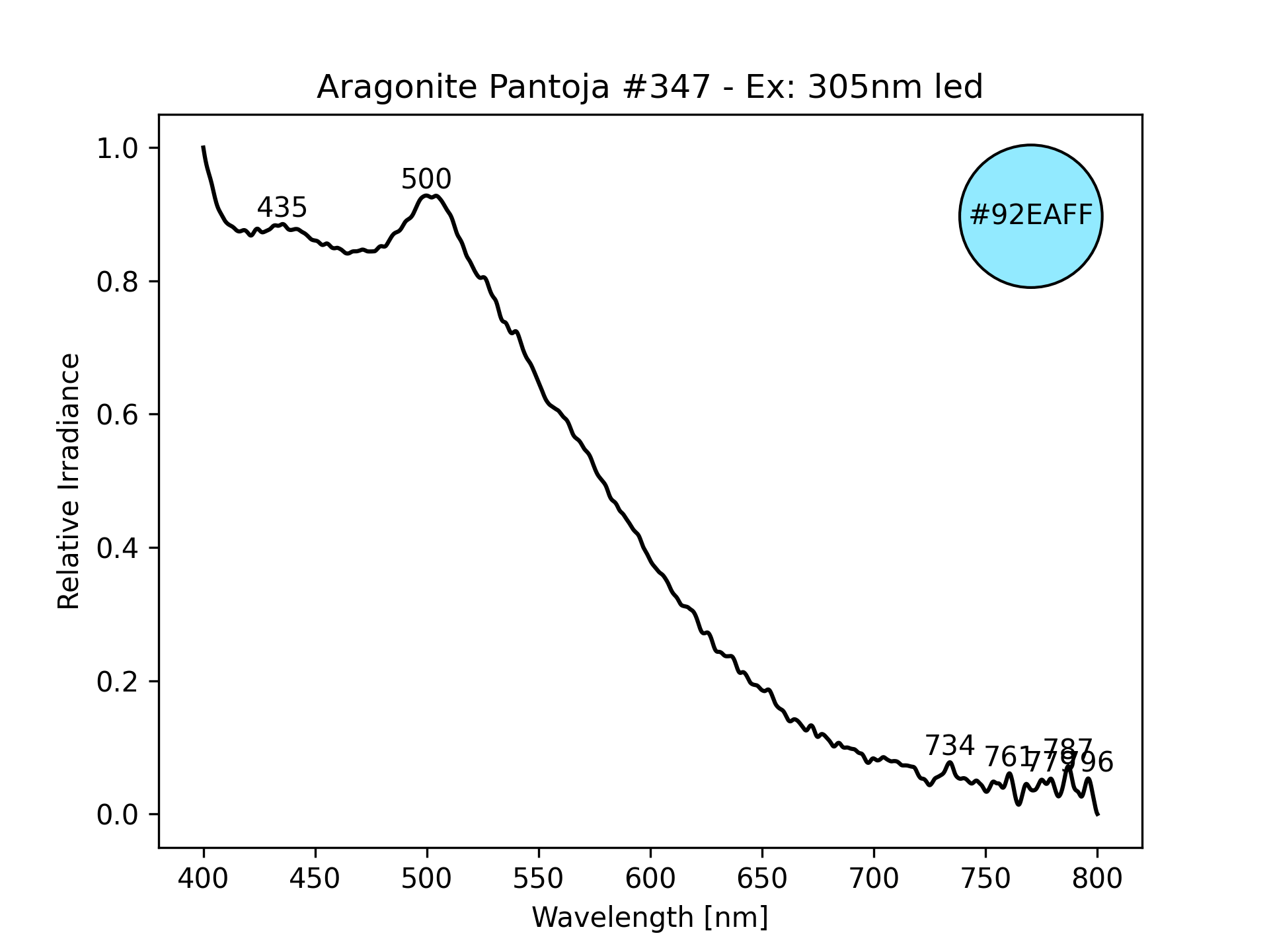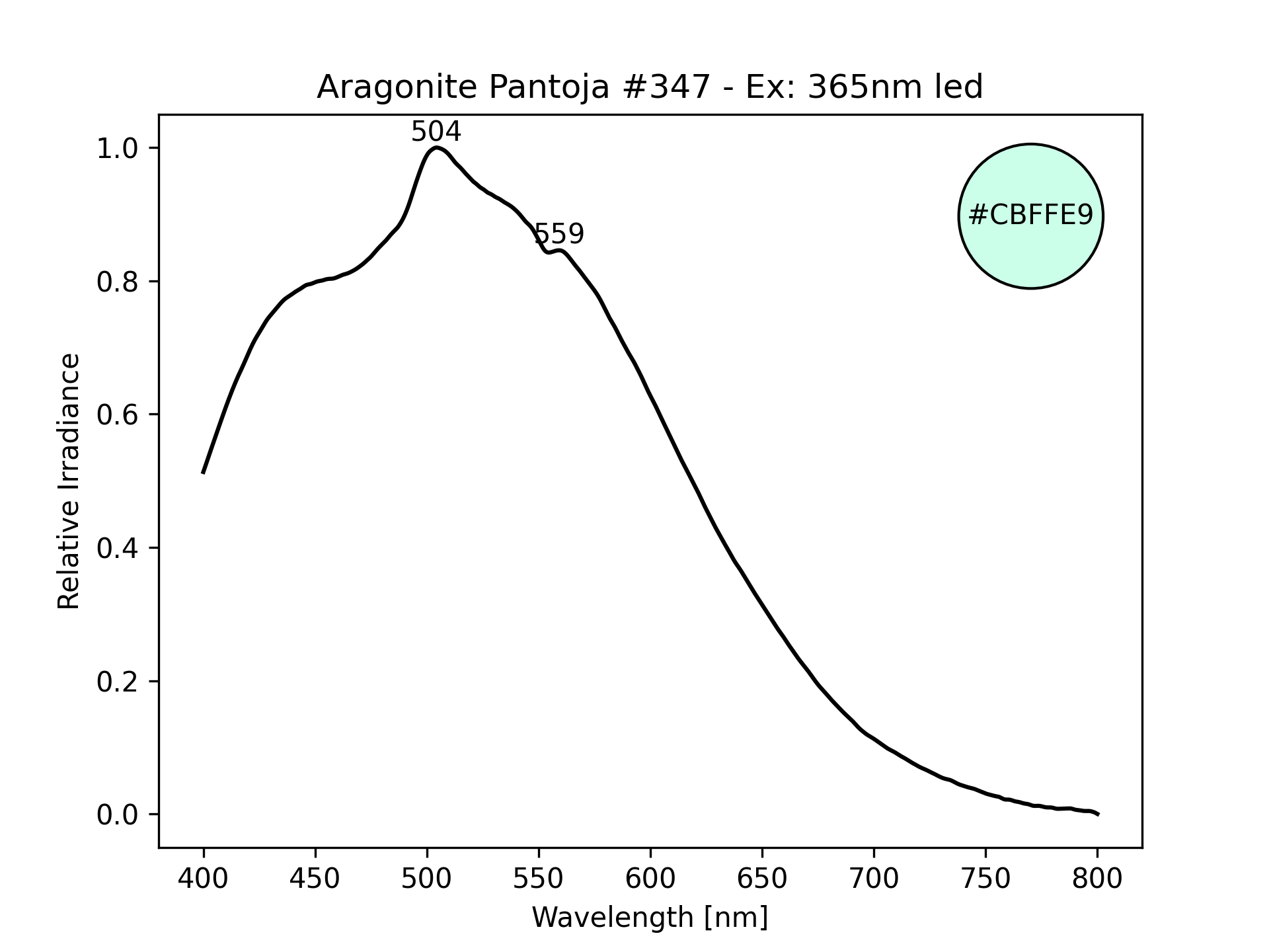 | Aragonite (#347) | La Serna (Tinaja) Quarry, Pantoja, Spain | 275nm LED | Organic | |