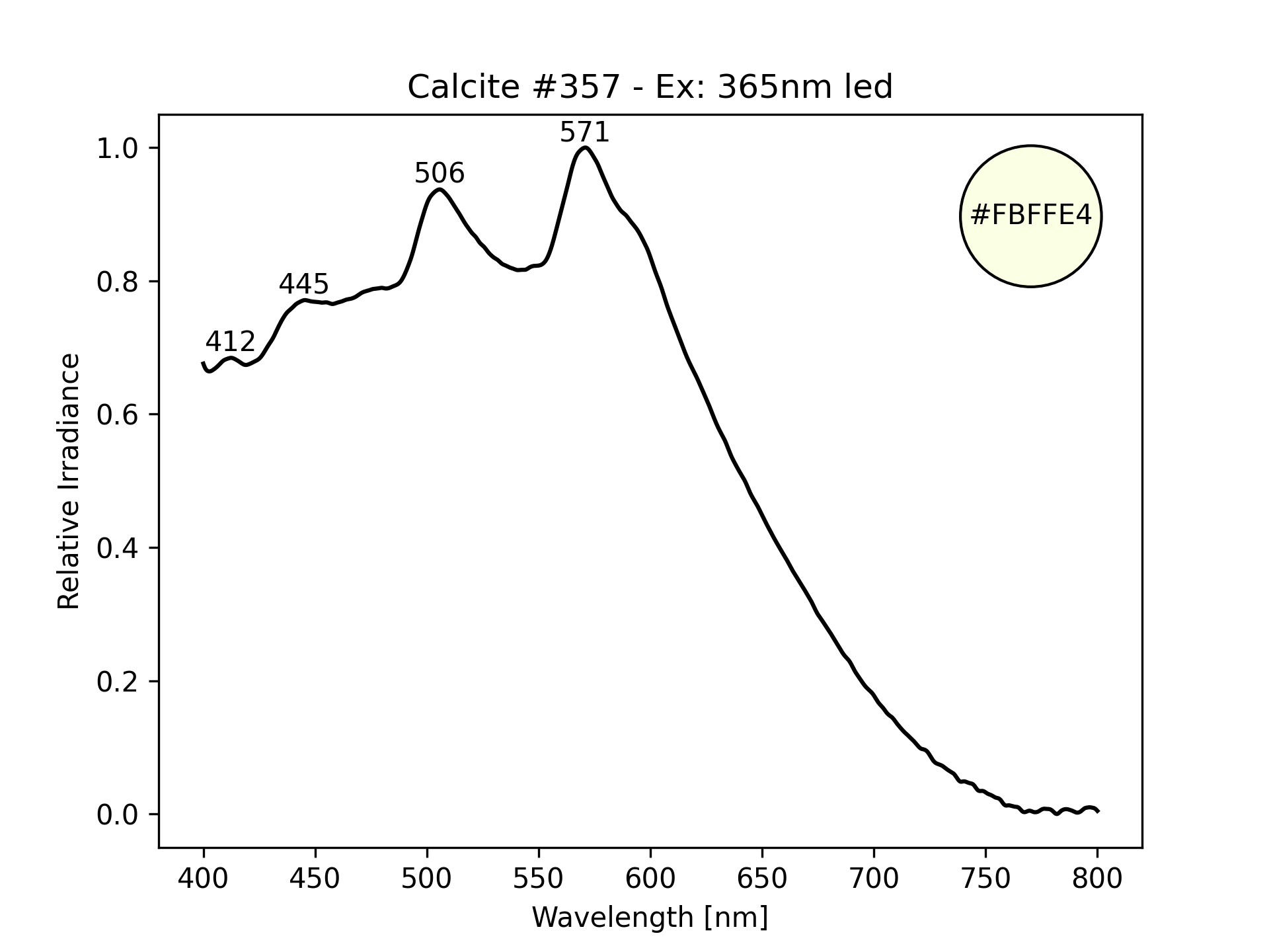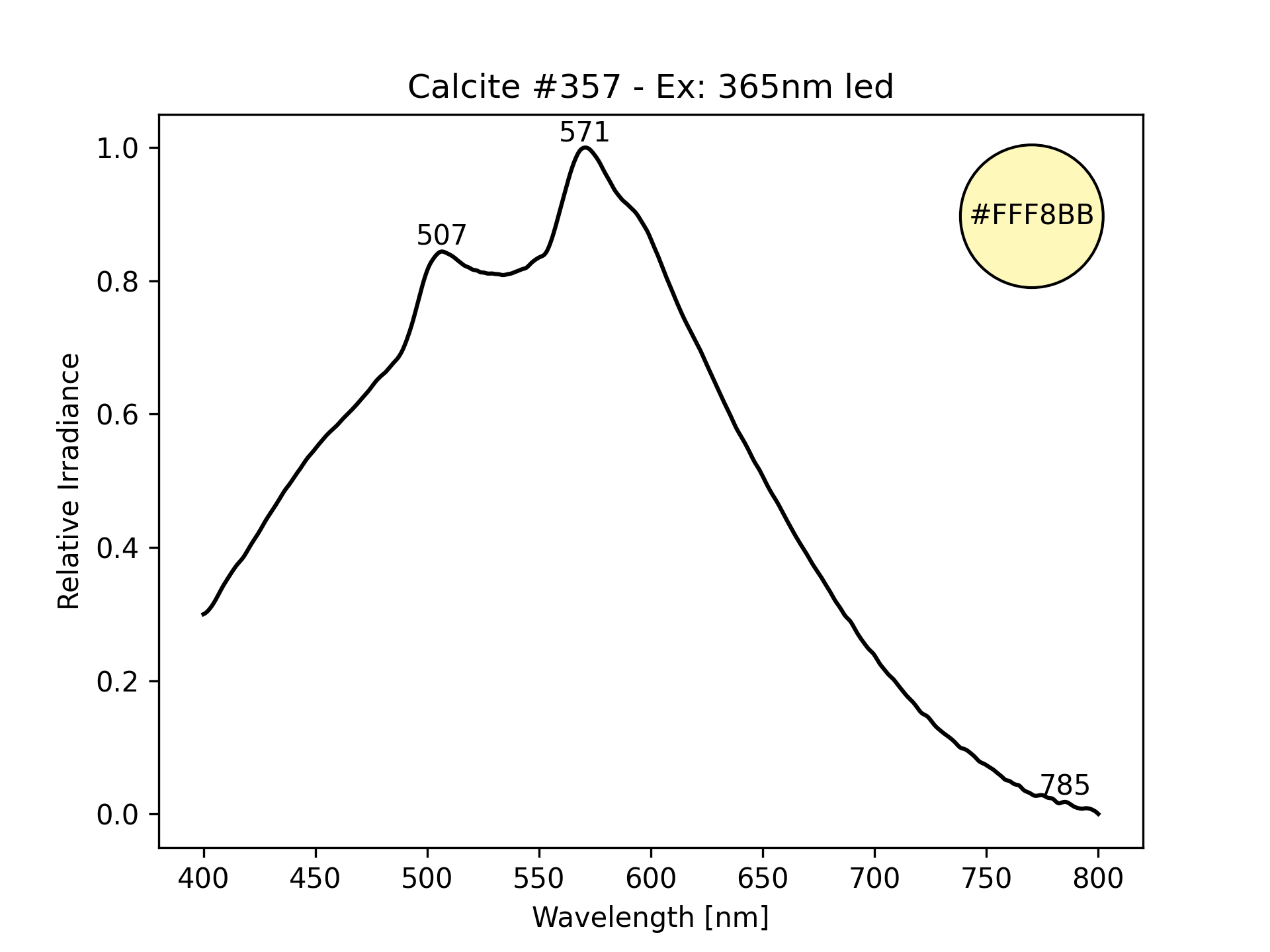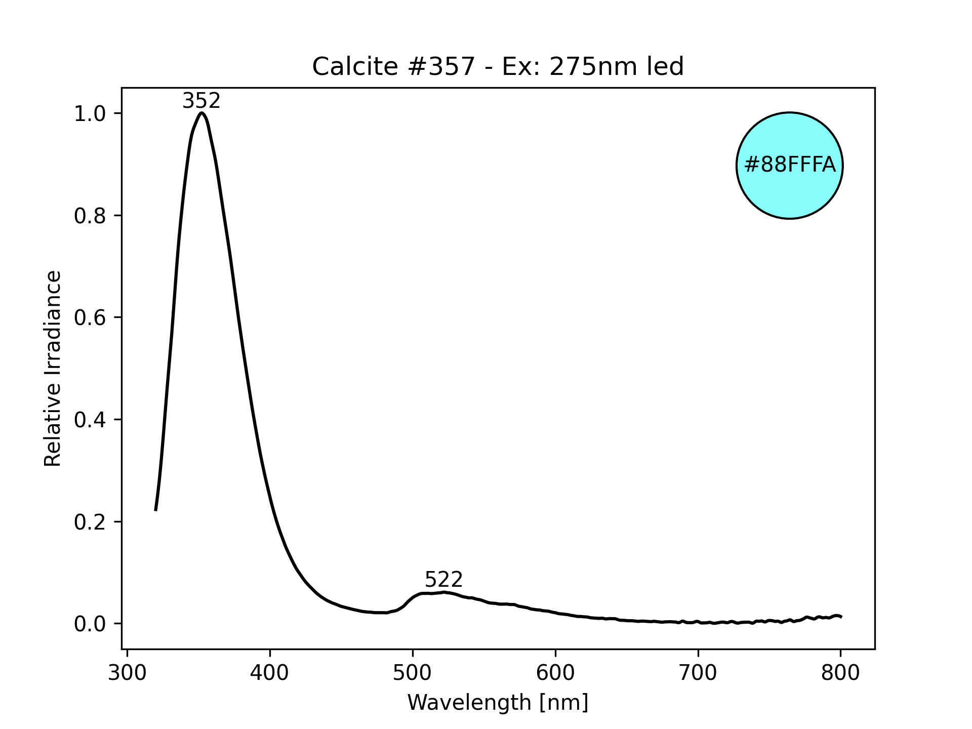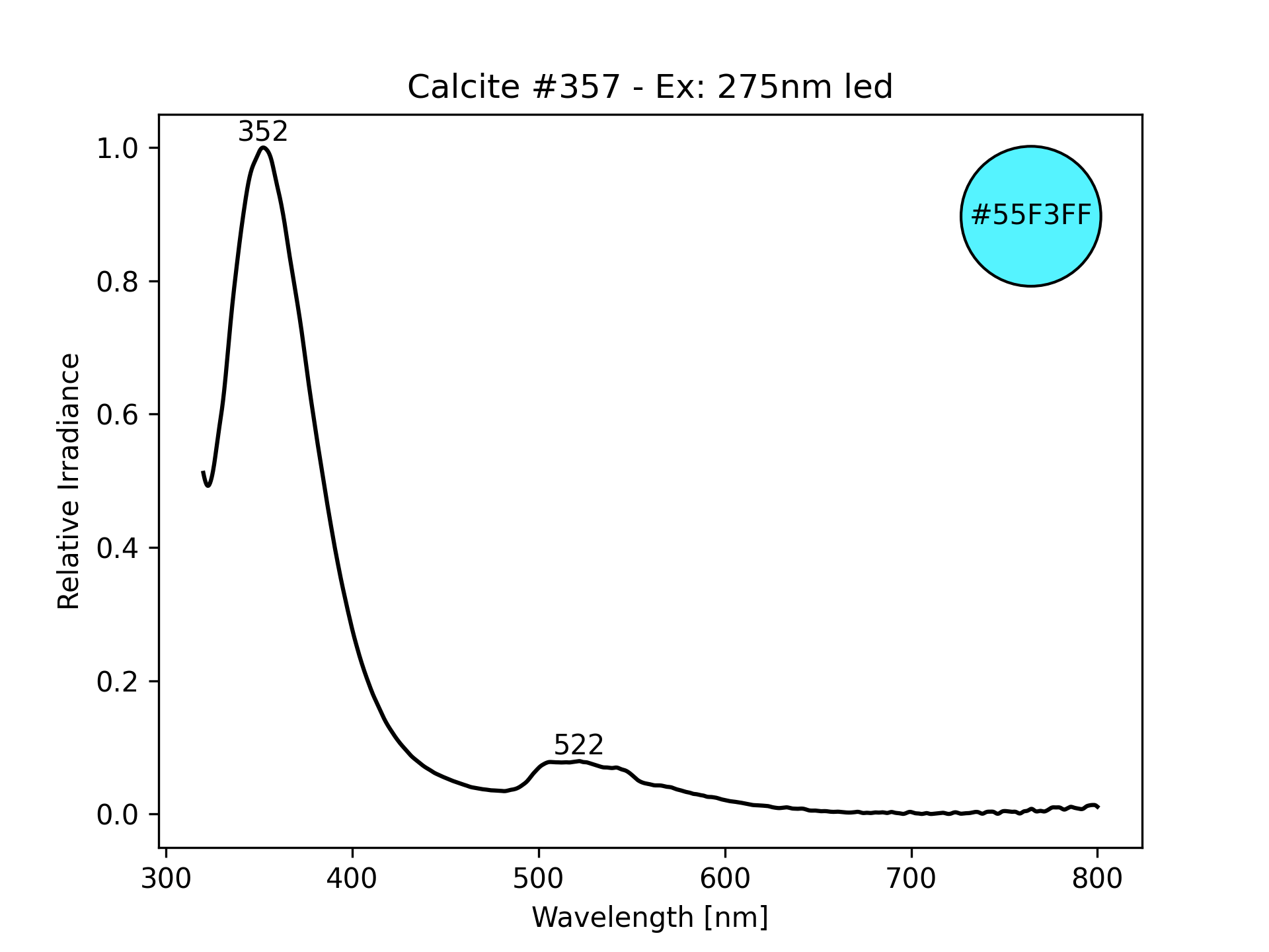 | Calcite (#357) | Malmberget, Gällivare, Norrbotten County, Sweden | 275nm LED | Ce3+; ?? | |