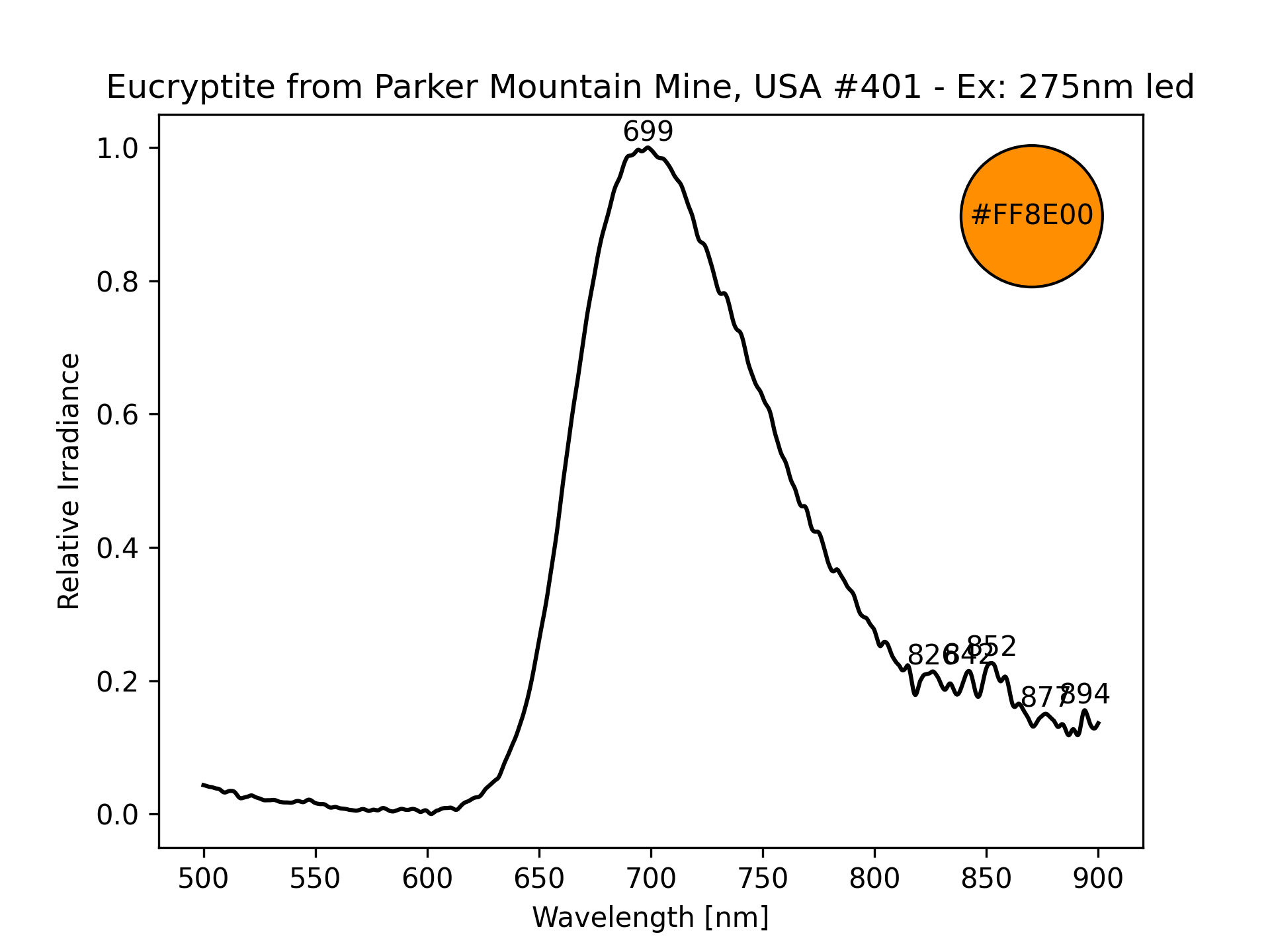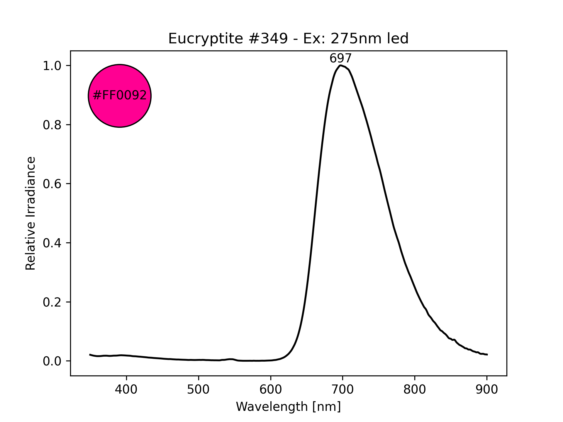 | Eucryptite (#401) | Parker Mountain Mine, New Hampshire, USA | 275nm LED | Fe3+ | |