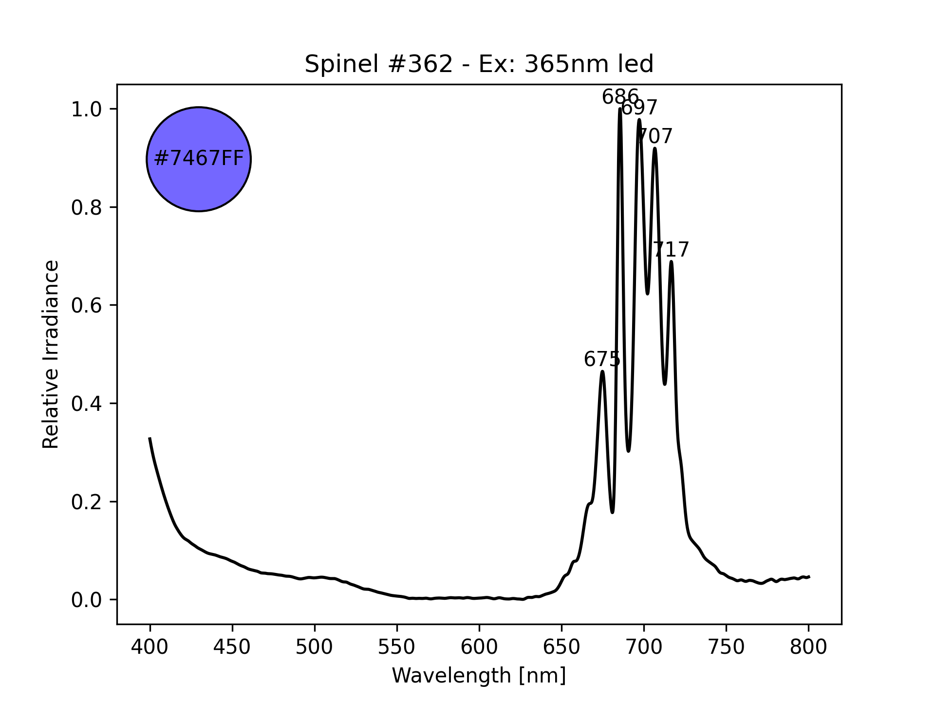 | Spinel (#362) | Lục Yên District, Yên Bái Province, Vietnam | 365nm LED | Cr3+ | |
