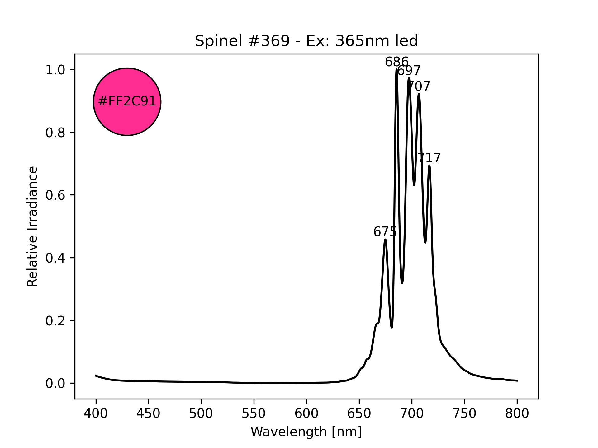 | Spinel (#369) | Lục Yên District, Yên Bái Province, Vietnam | 365nm LED | Cr3+ | |