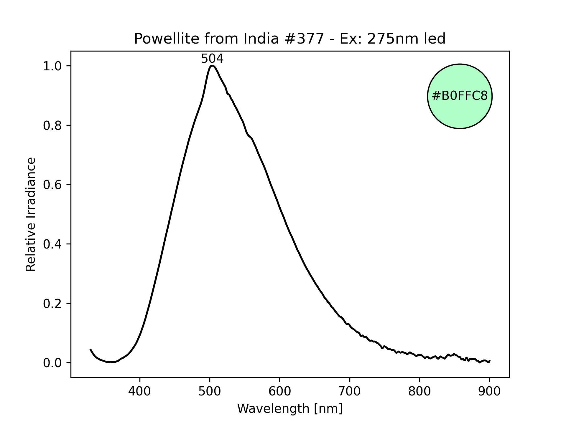 | Powellite (#377) | Maharashtra, India | 275nm LED | MoO42- | |