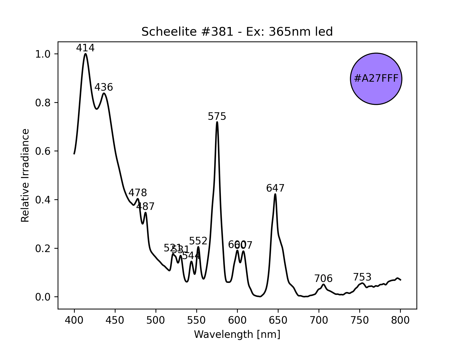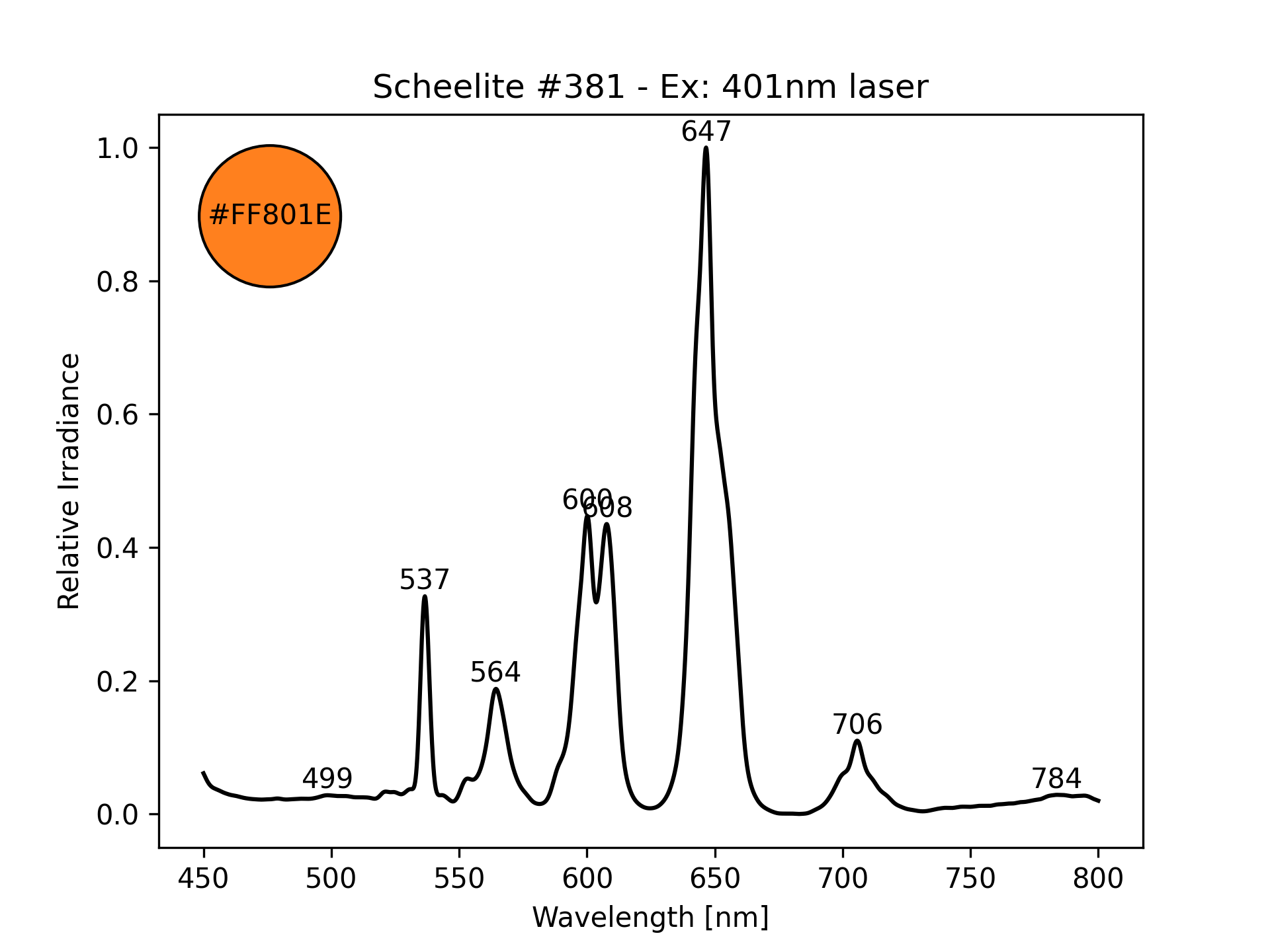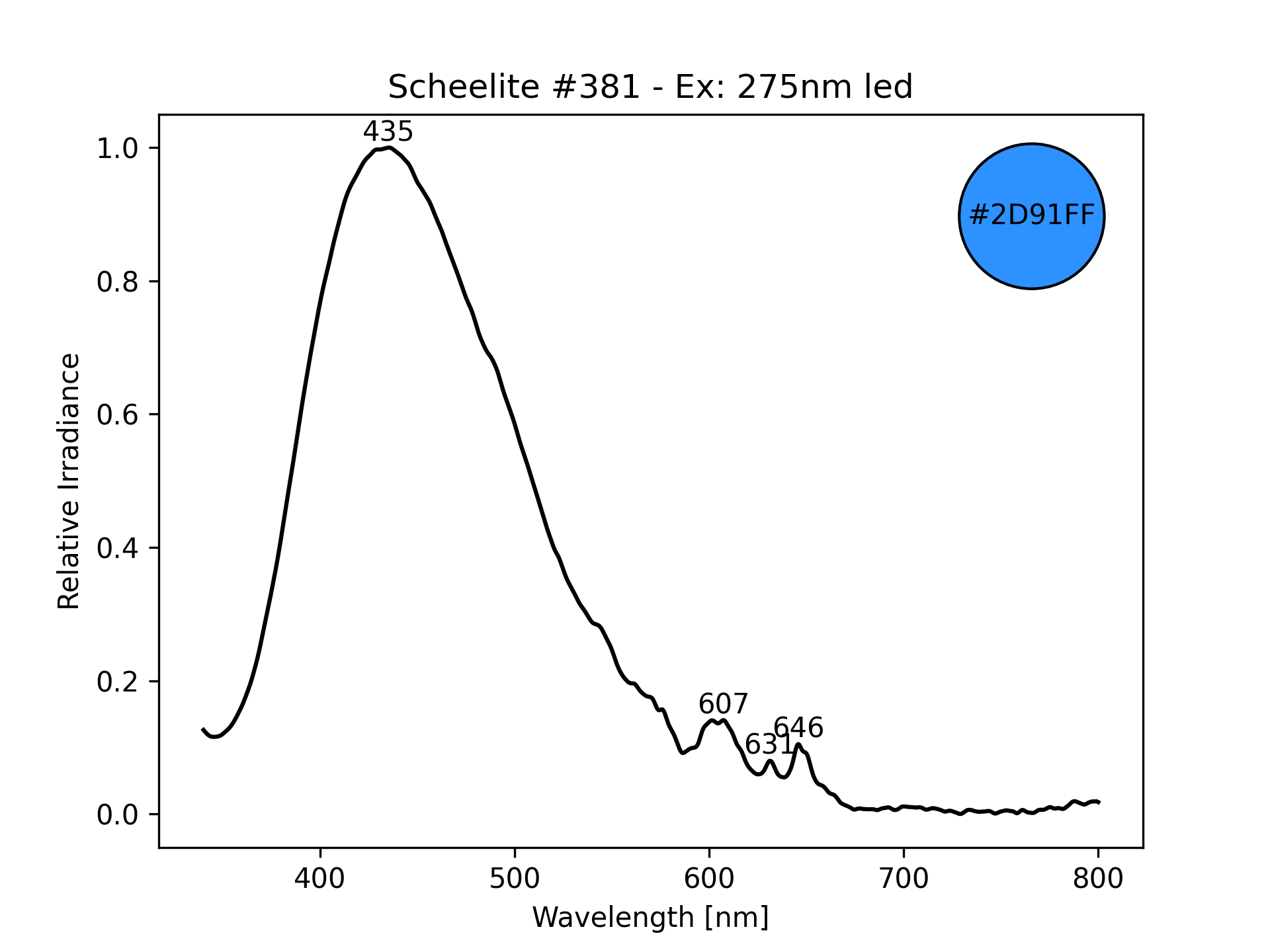| Scheelite (#381) | Sichuan, China | 275nm LED | WO42-;REE | |