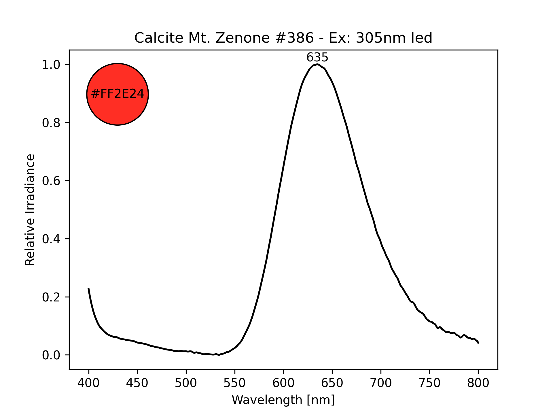 | Calcite (#386) | Monte Zenone, Genoa, Liguria, Italy | 305nm LED | Mn2+ | |