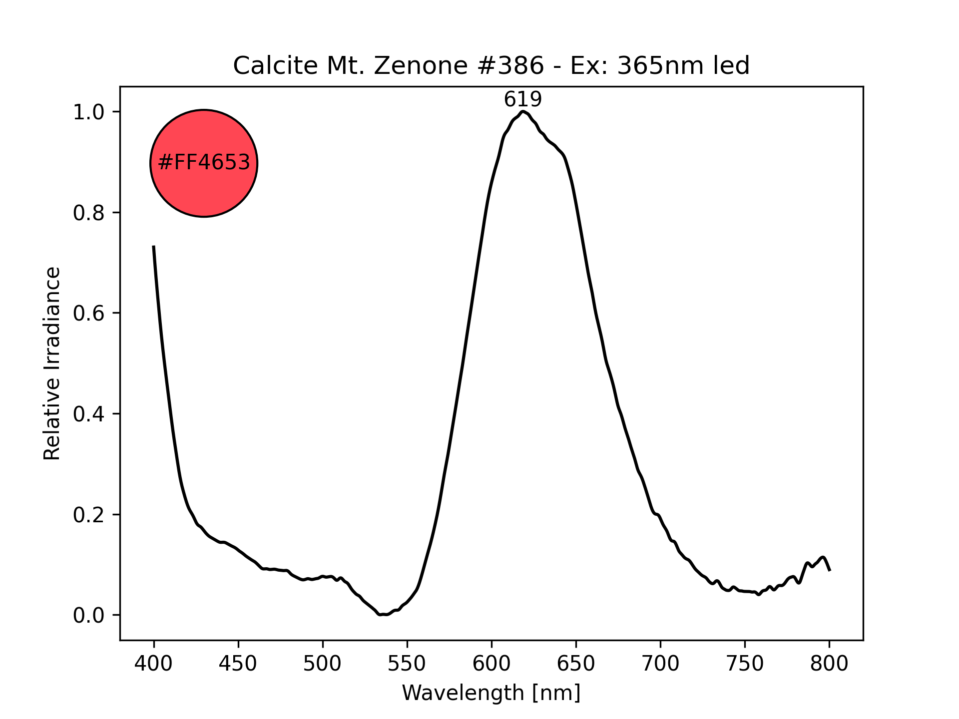 | Calcite (#386) | Monte Zenone, Genoa, Liguria, Italy | 365nm LED | Mn2+ | |