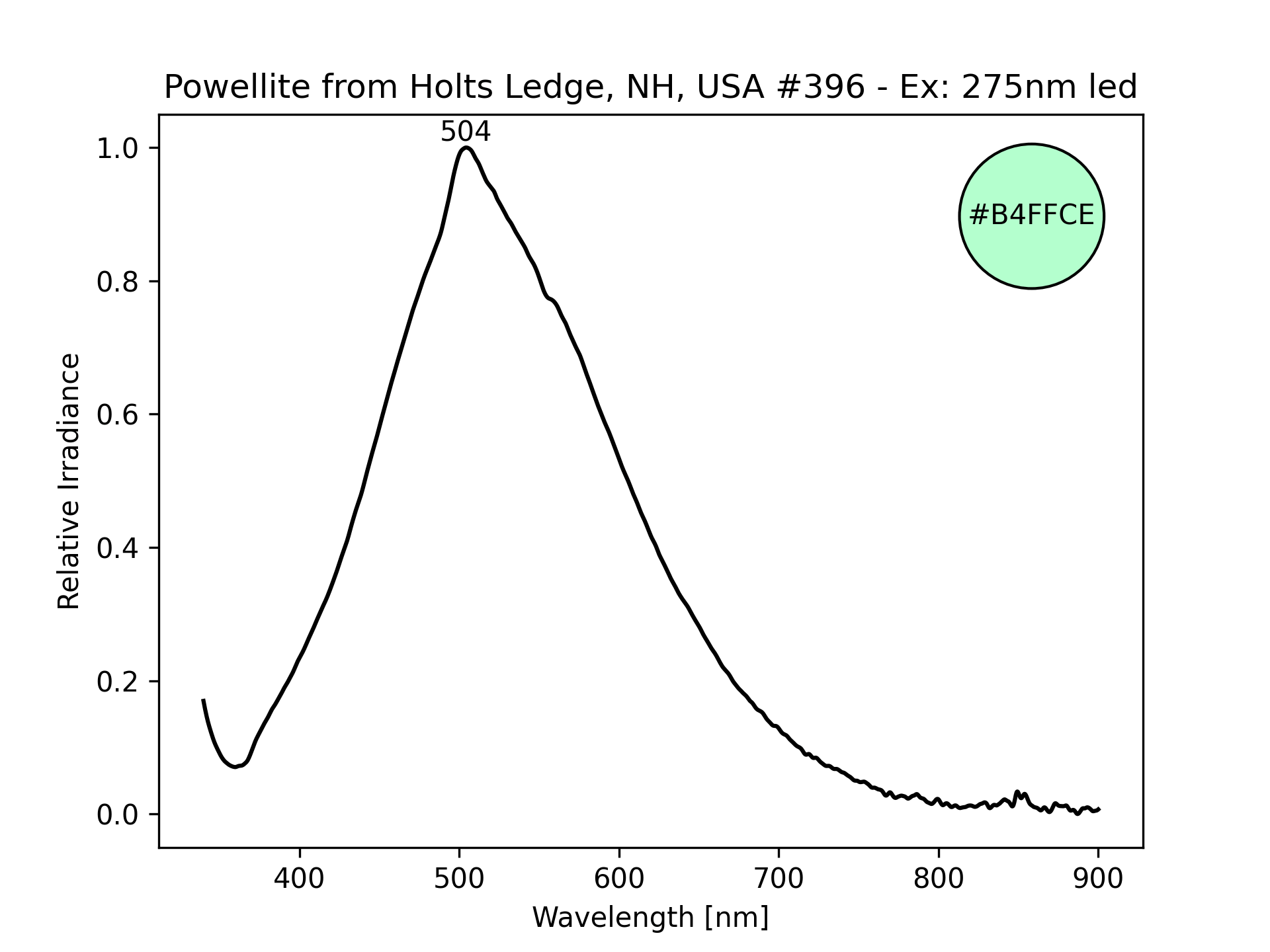 | Powellite (#396) | Holts Ledge, Lyme, New Hampshire, USA | 275nm LED | MoO42- | |