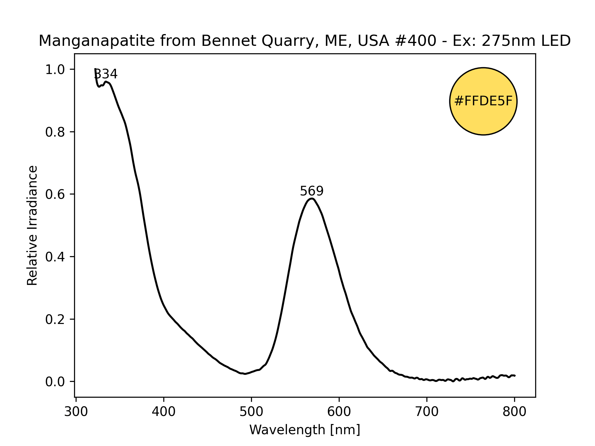 | Fluorapatite (#400) | Bennett Quarry, Oxford County, Maine, USA | 275nm LED | Mn2+ | |