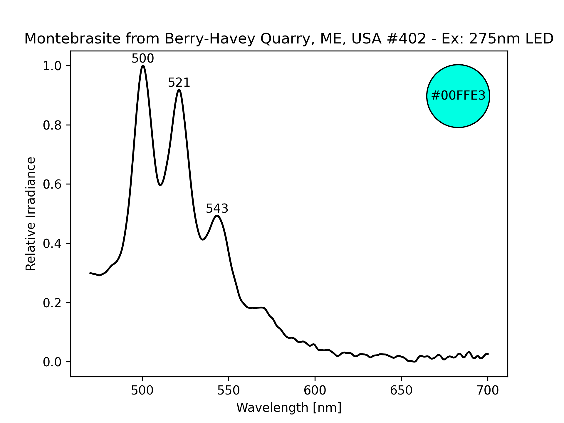 | Montebrasite (#402) | Berry-Havey Quarry, Poland, Maine, USA | 275nm LED | UO22+ | |