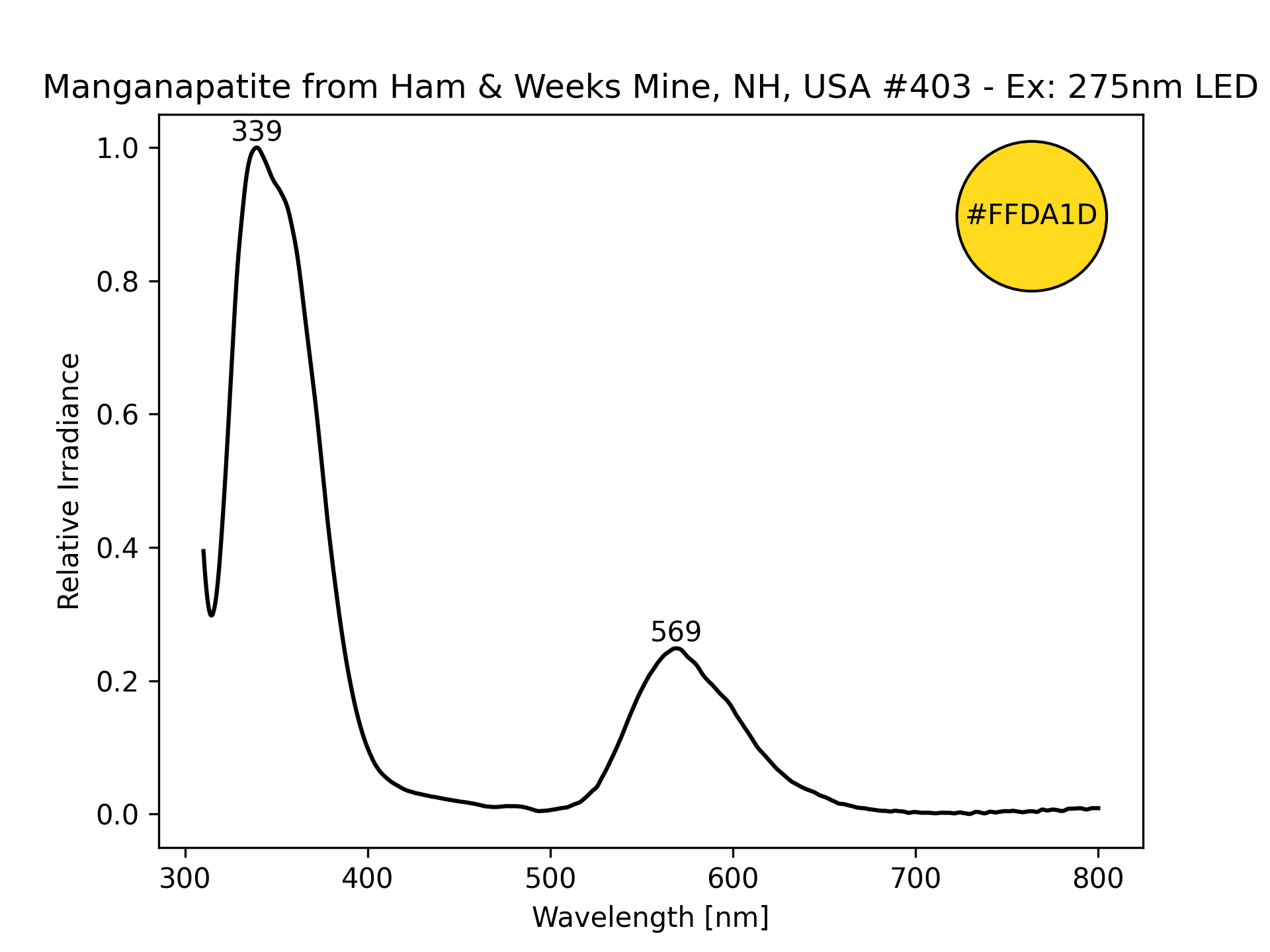 | Manganapatite (#403) | Ham and Weeks Mine, Wakefield, New Hampshire, USA | 275nm LED | Mn2+ | |