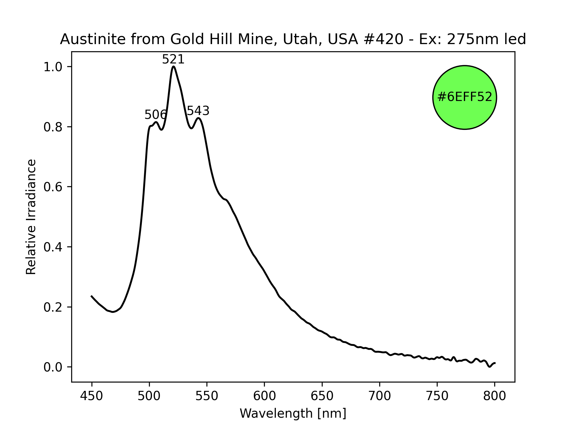 | Austinite (#420) | Gold Hill Mine, Tooele Co., Utah, USA | 275nm LED | UO22+ | |