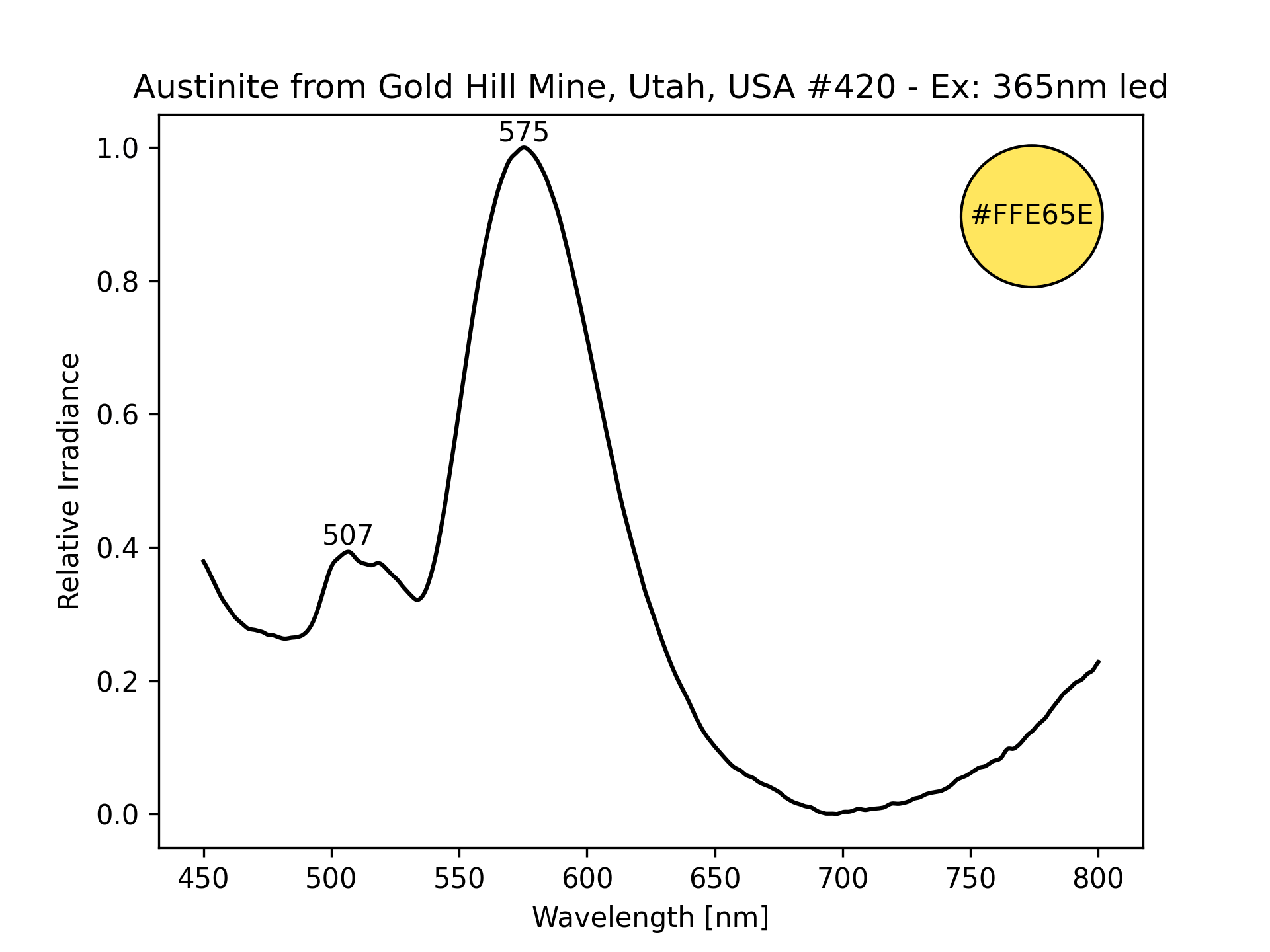 | Austinite (#420) | Gold Hill Mine, Tooele Co., Utah, USA | 365nm LED | Mn2+ | |