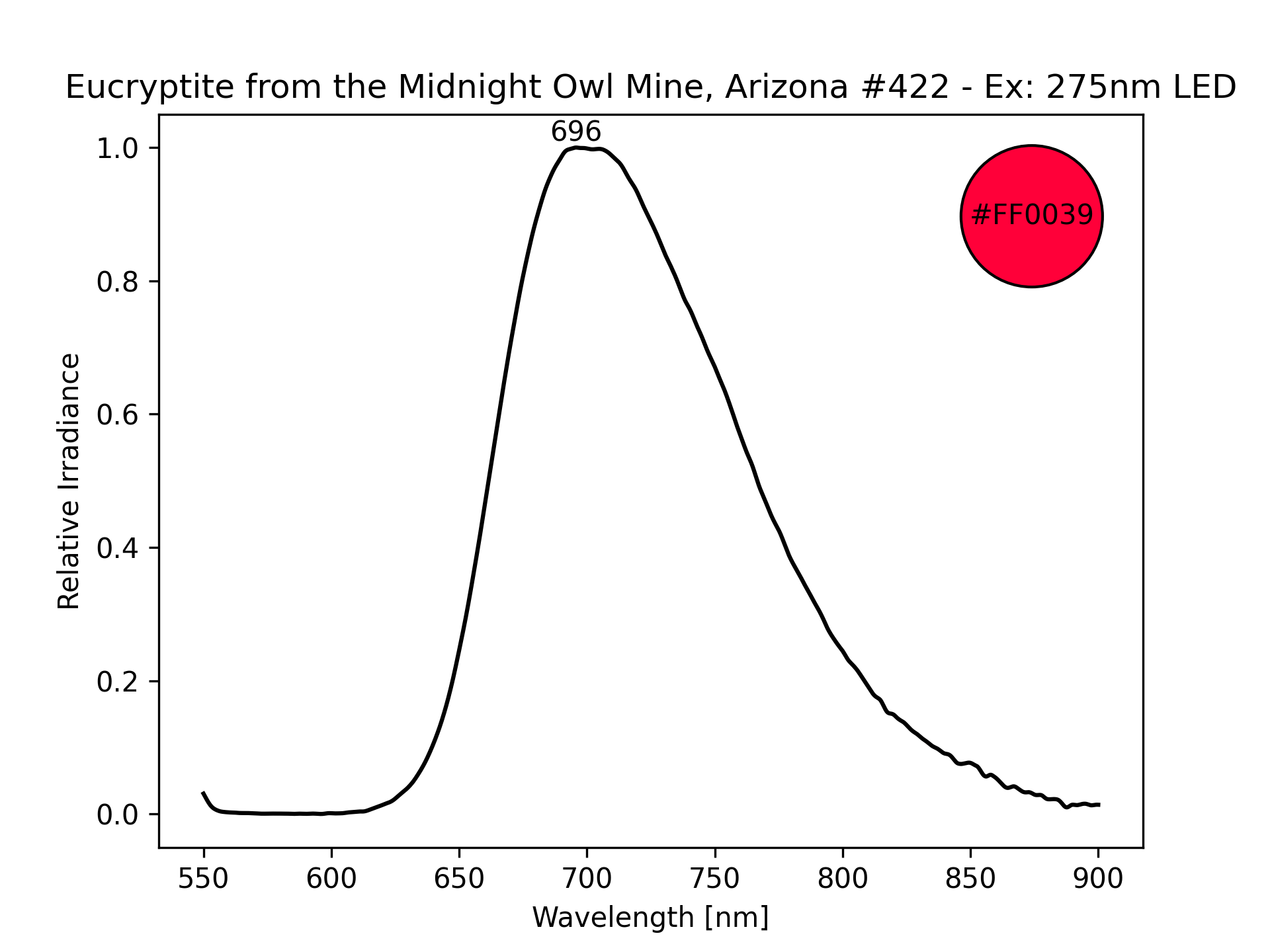| Eucryptite (#422) | Midnight Owl Mine, Arizona, USA | 275nm LED | Fe3+ | |