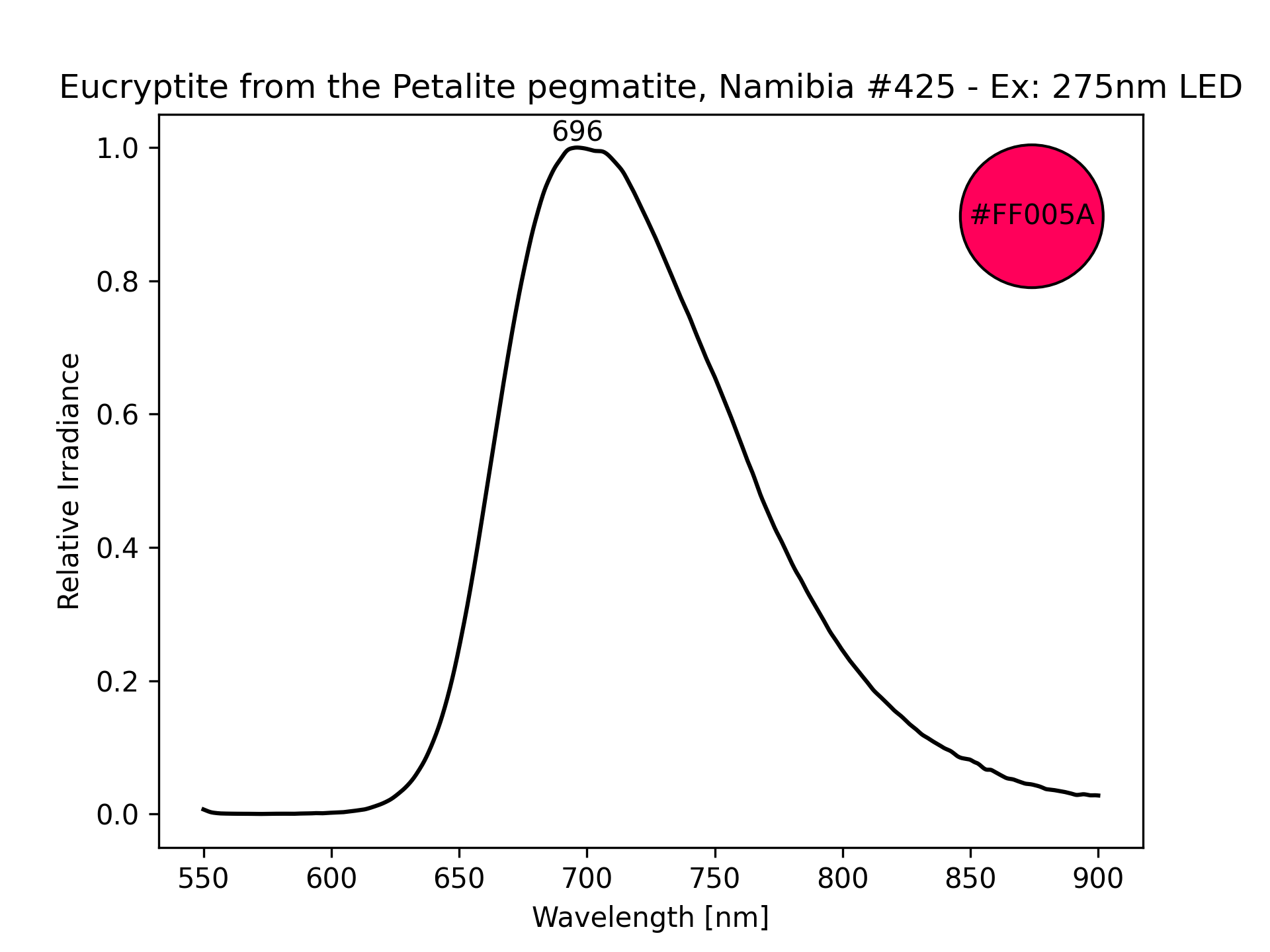 | Eucryptite (#425) | Petalite pegmatite, Erongo Region, Namibia | 275nm LED | Fe3+ | |