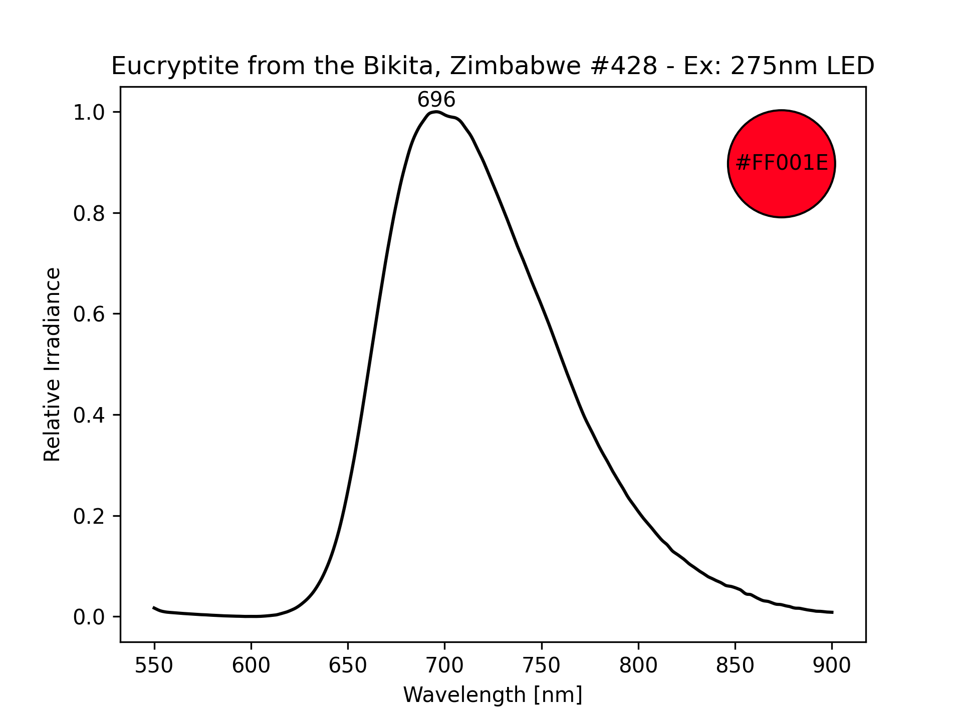 | Eucryptite (#428) | Bikita pegmatite, Masvingo, Zimbabwe | 275nm LED | Fe3+ | |