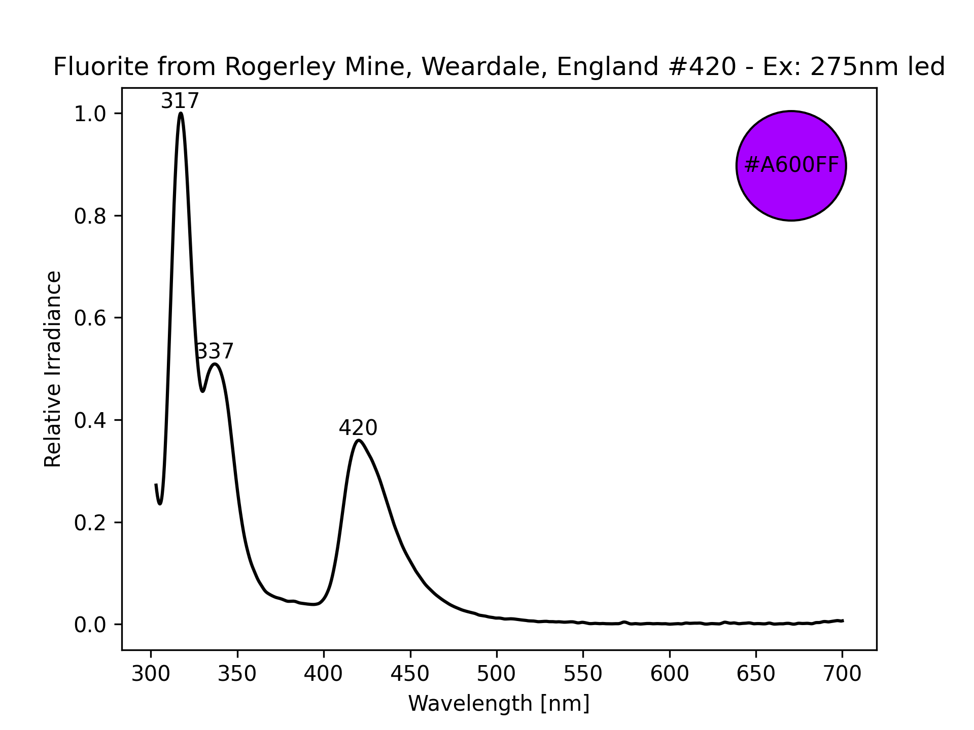 | Fluorite (#429) | Rogerley Mine, Weardale, UK | 275nm LED | Eu2+; Ce3+ | |
