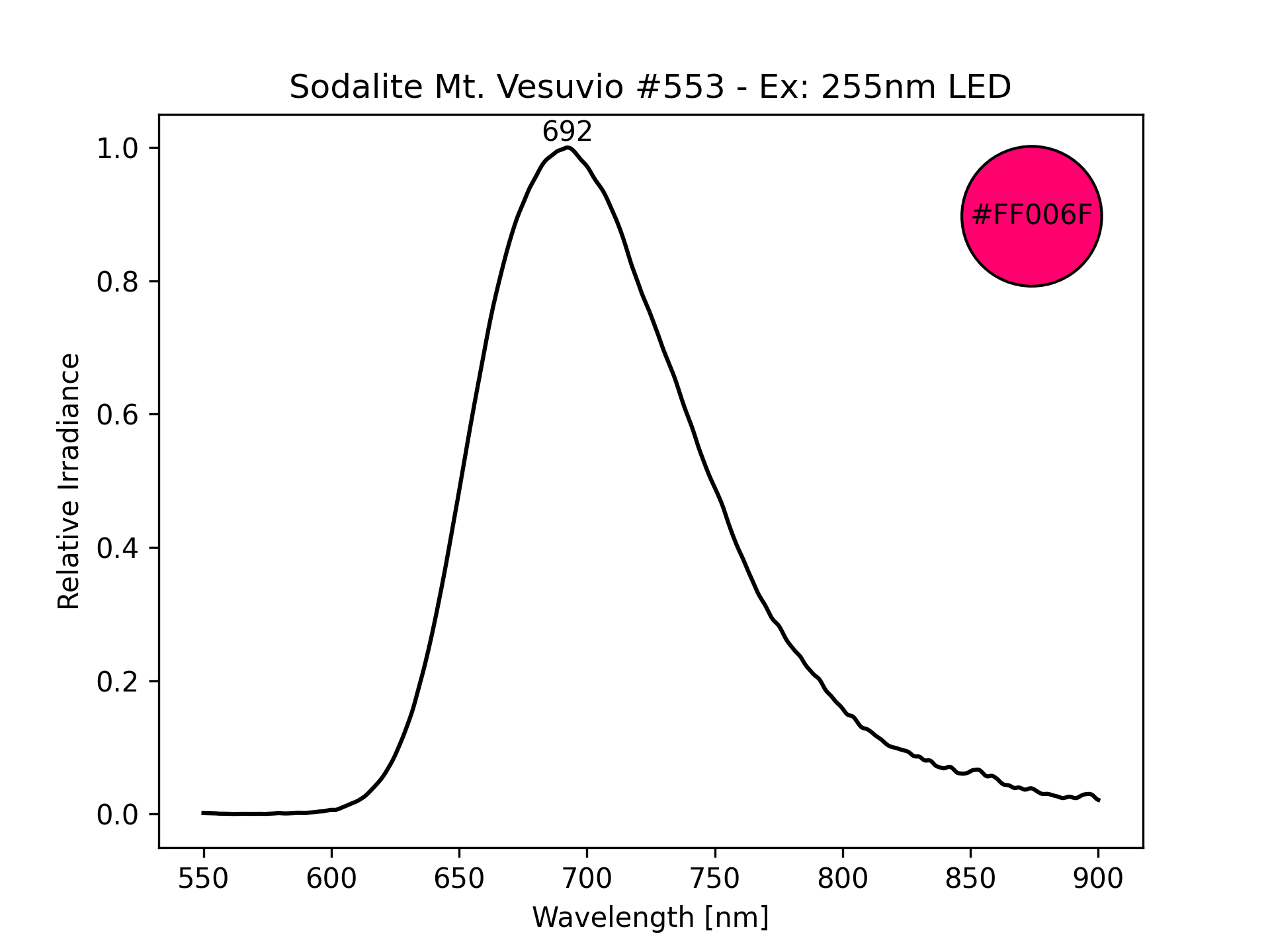| Sodalite (#553) | Mount Vesuvius, Naples, Campania, Italy | 255nm LED | Fe3+ | |