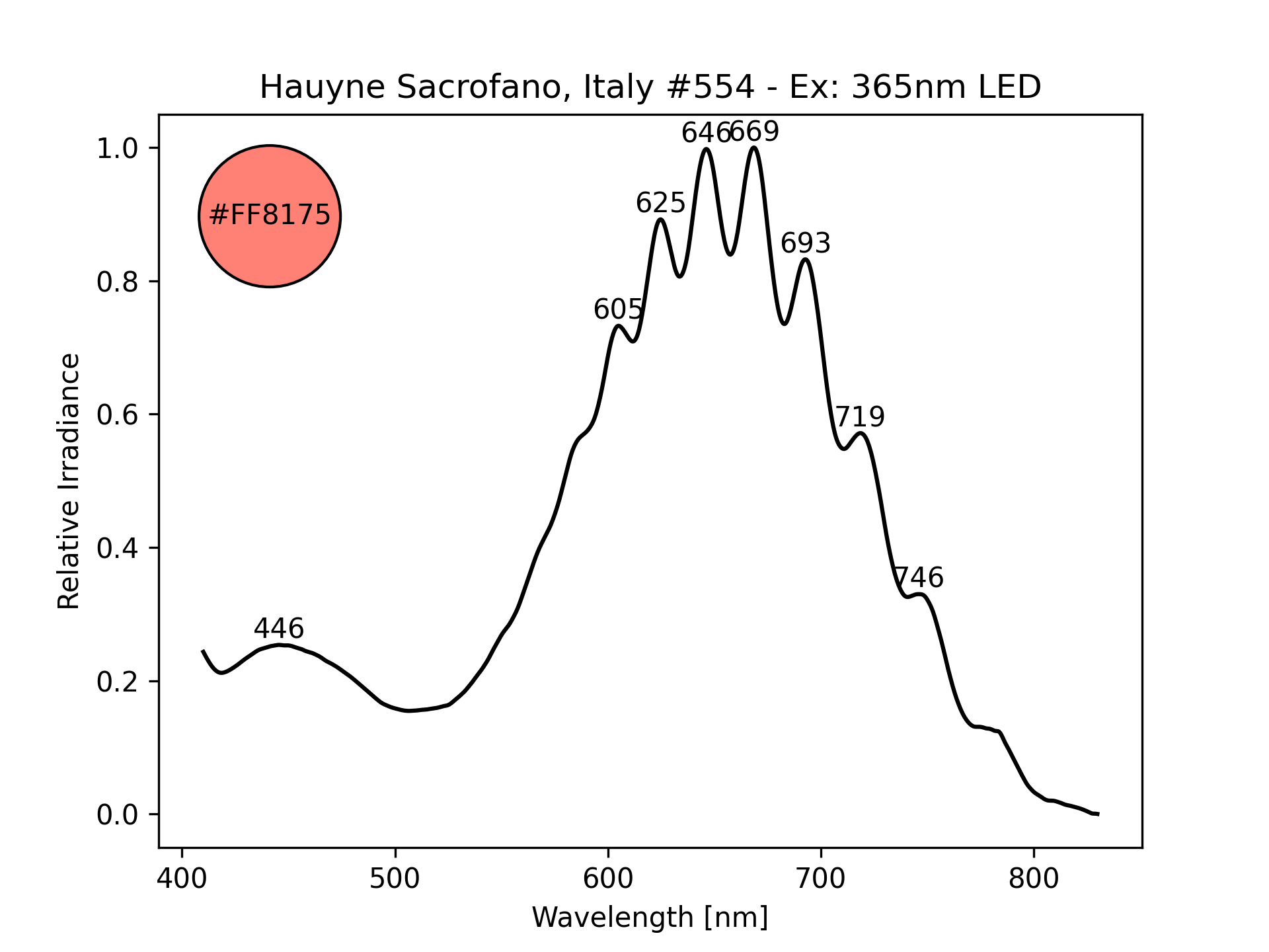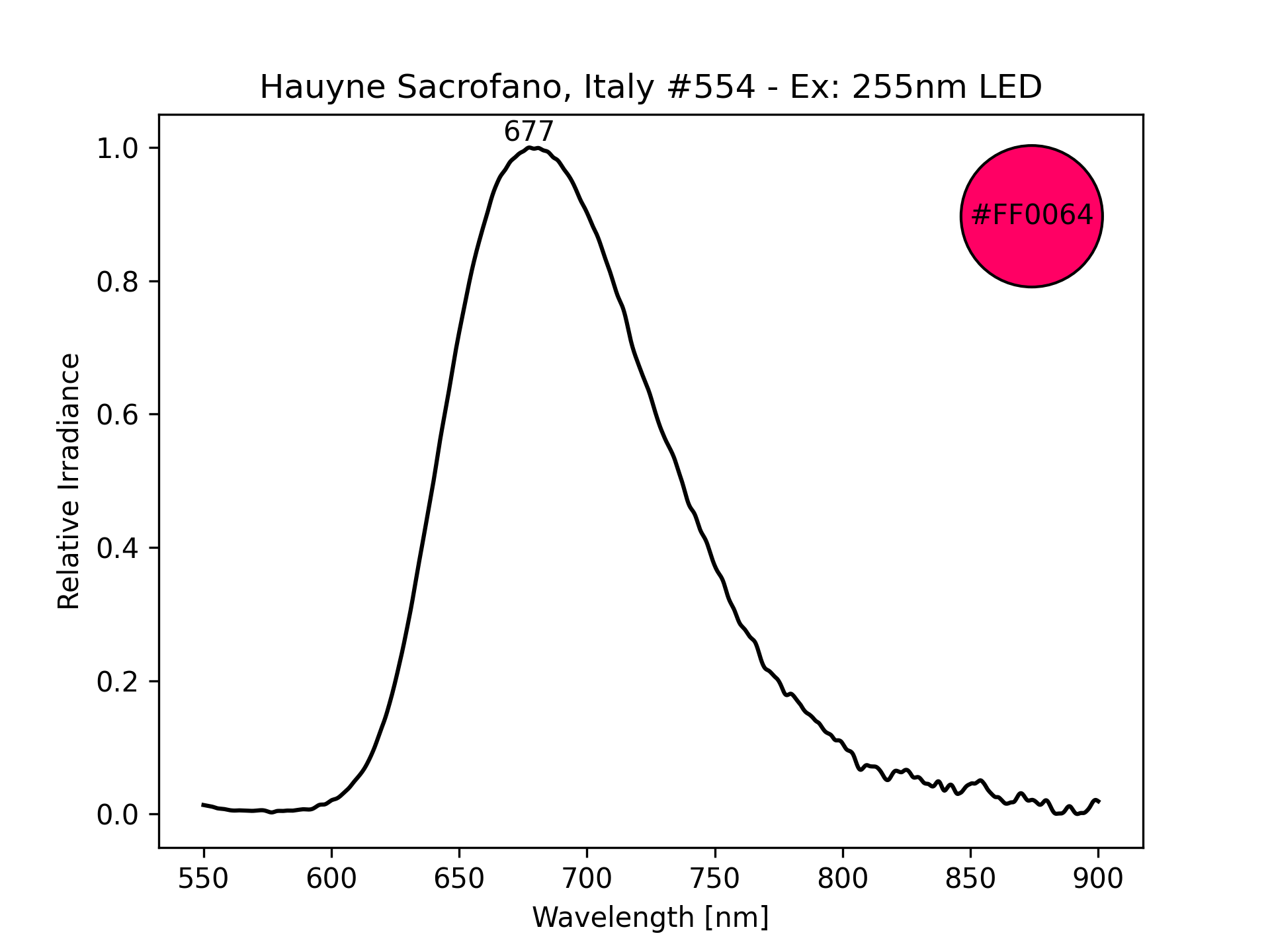 | Hauyne (#554) | Biachella Valley, Sacrofano, Lazio, Italy | 255nm LED | Fe3+ | |
