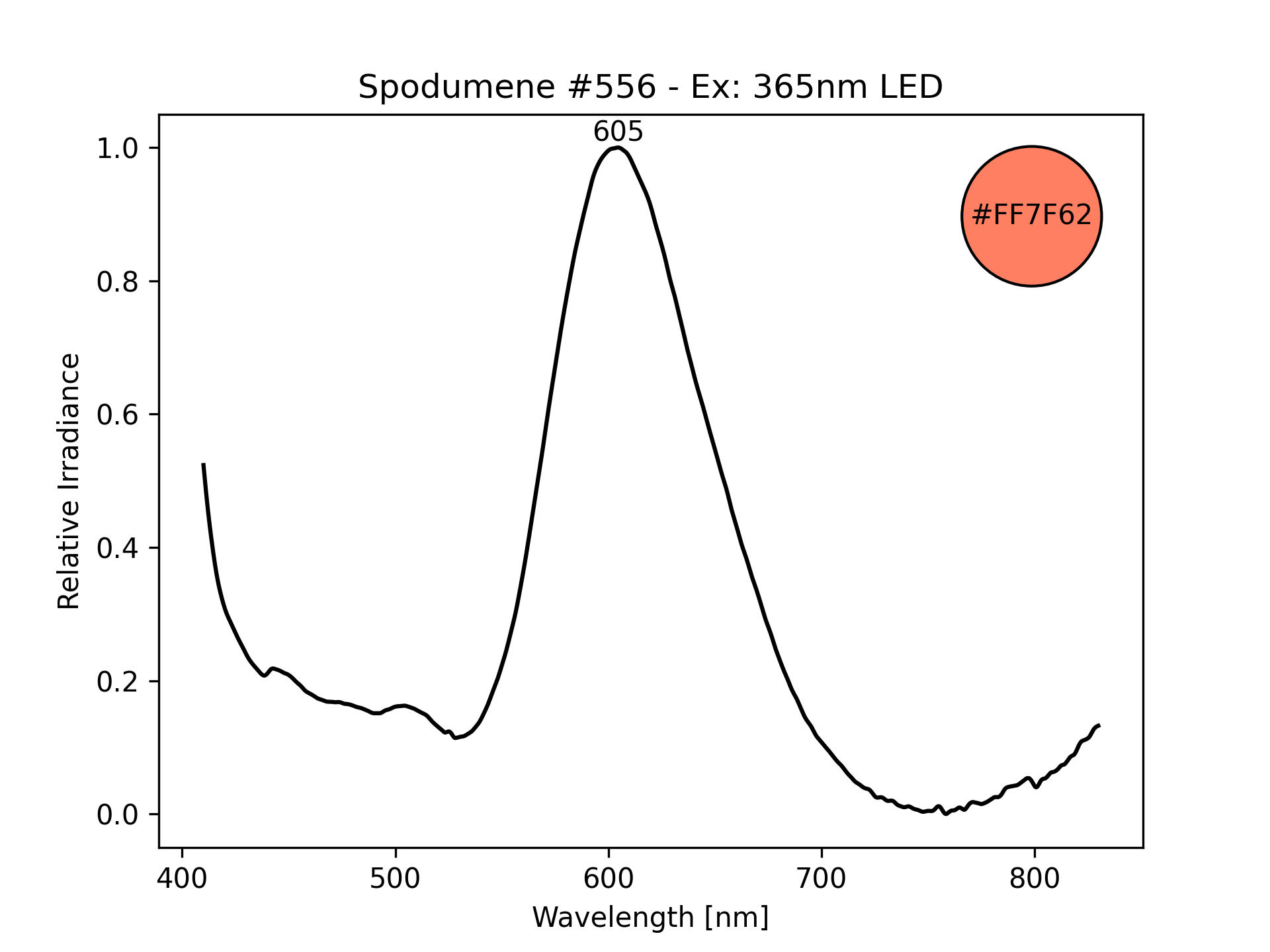 | Spodumene (#556) | Pakistan | 365nm LED | Mn2+ | |